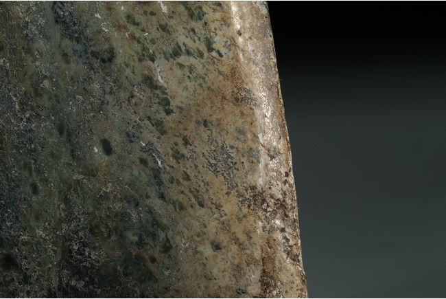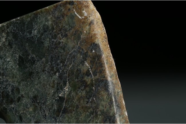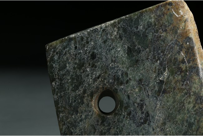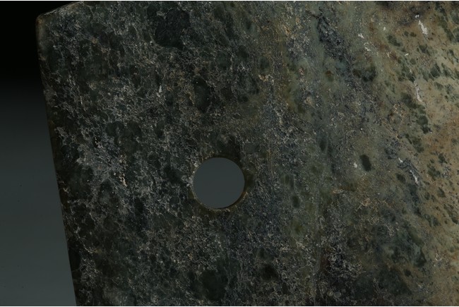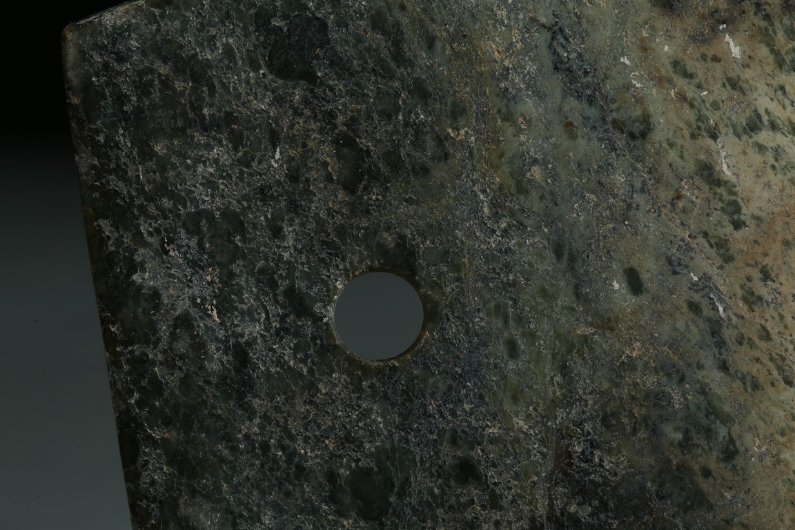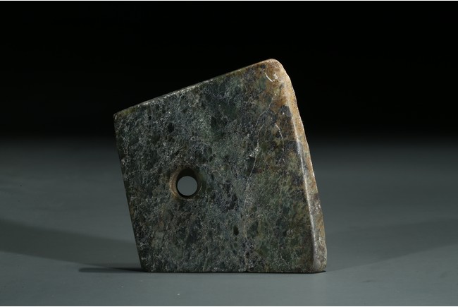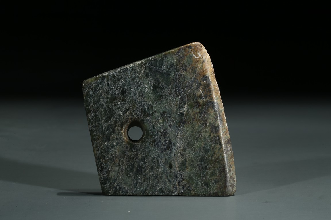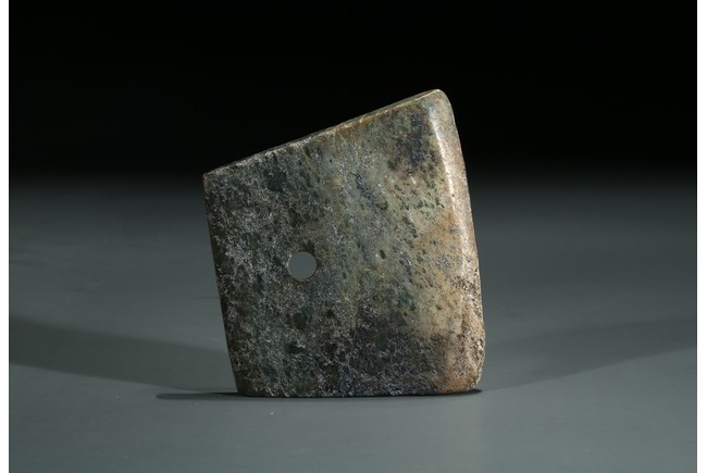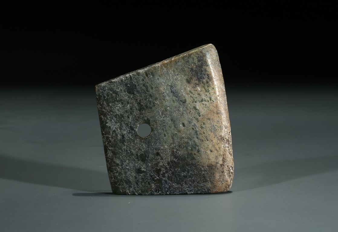 The wide blade flaring towards the curved cutting edge, pierced with an aperture toward other end.Pre-history period.