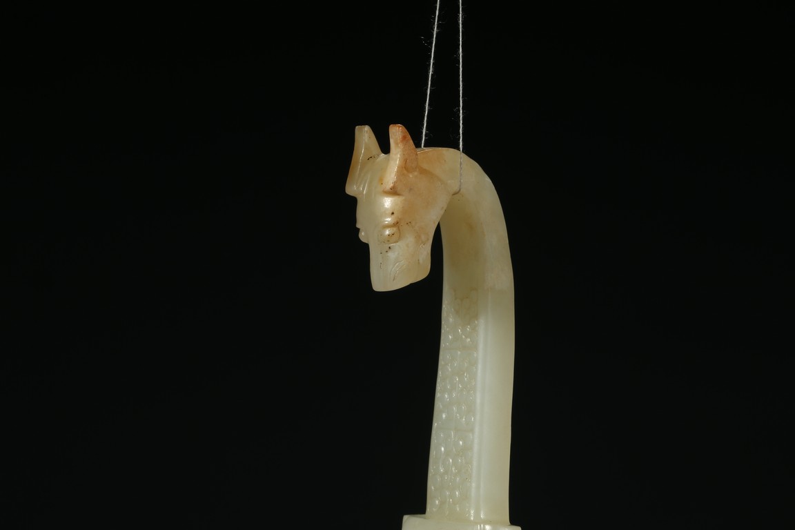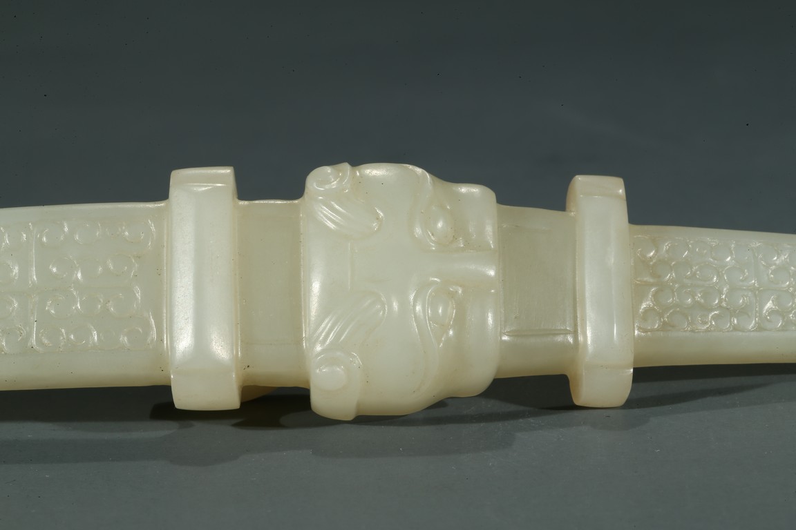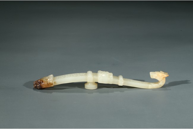 Carved on both ends with mythical beast head terminals, body with 'grain' pattern.