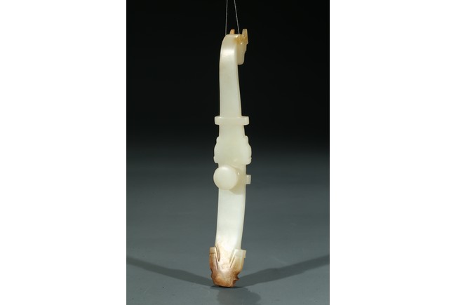 此件帶鉤以和田白玉雕琢而成,略帶沁色。運用鏤雕技法,鉤首雕做蒼龍,中部虎頭及尾部獸首,均有辟邪威嚴之意,為清代經典玉雕題材,玉質帶鉤出現較早,戰漢時期已普遍出現,基本結構為鉤首、鉤頸、鉤體、鉤面、鉤尾、鉤柱、鉤紐等組成。帶鉤的用途廣泛,它既是實用品,又是裝飾品,可謂實用與美觀的完美結合。