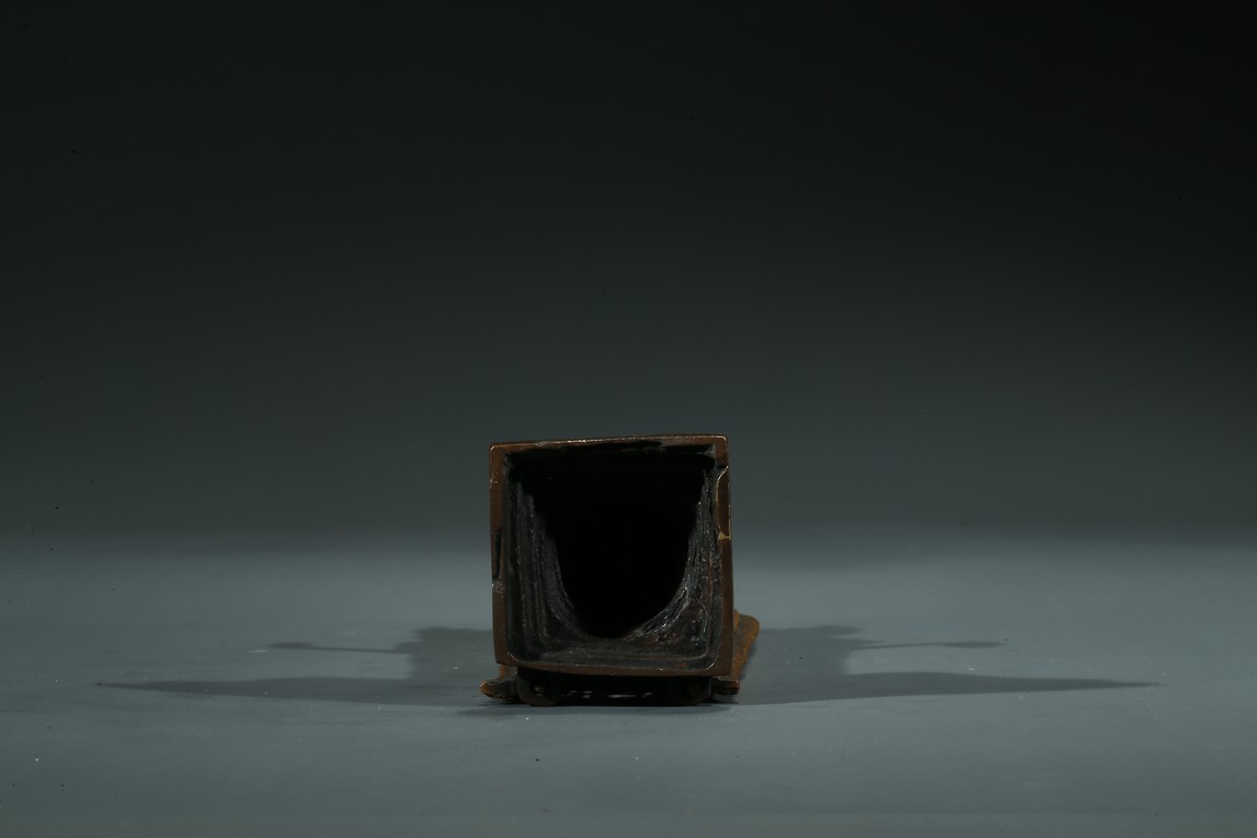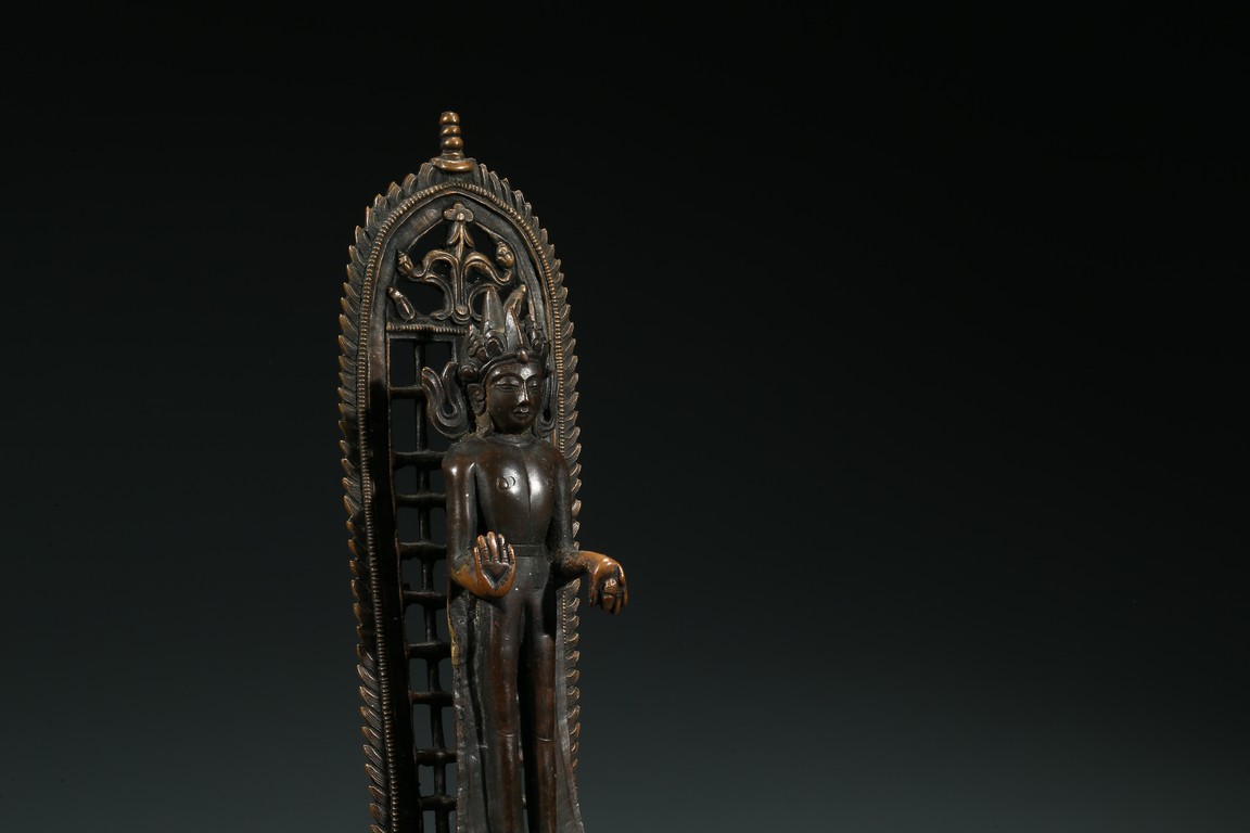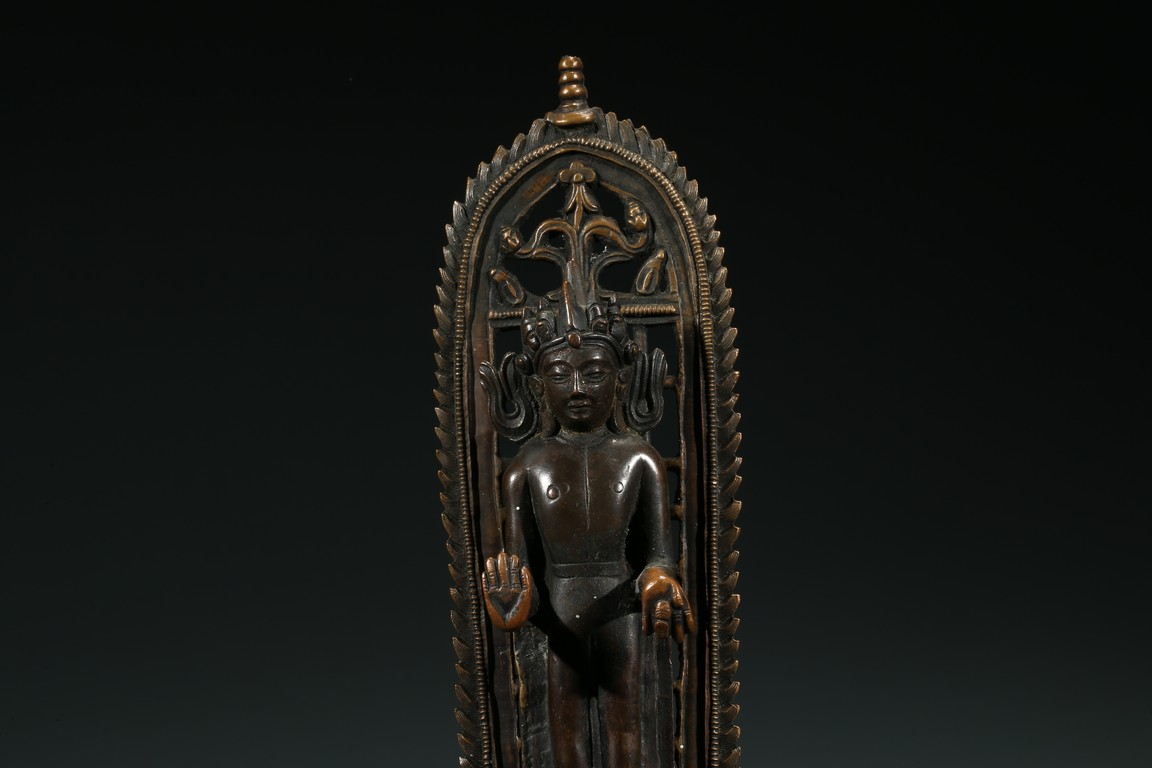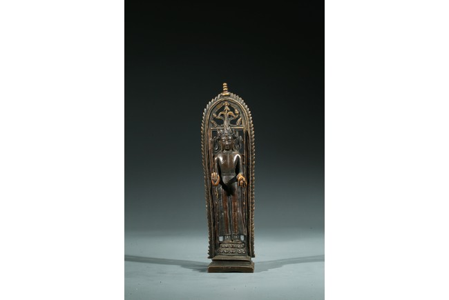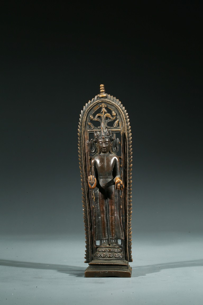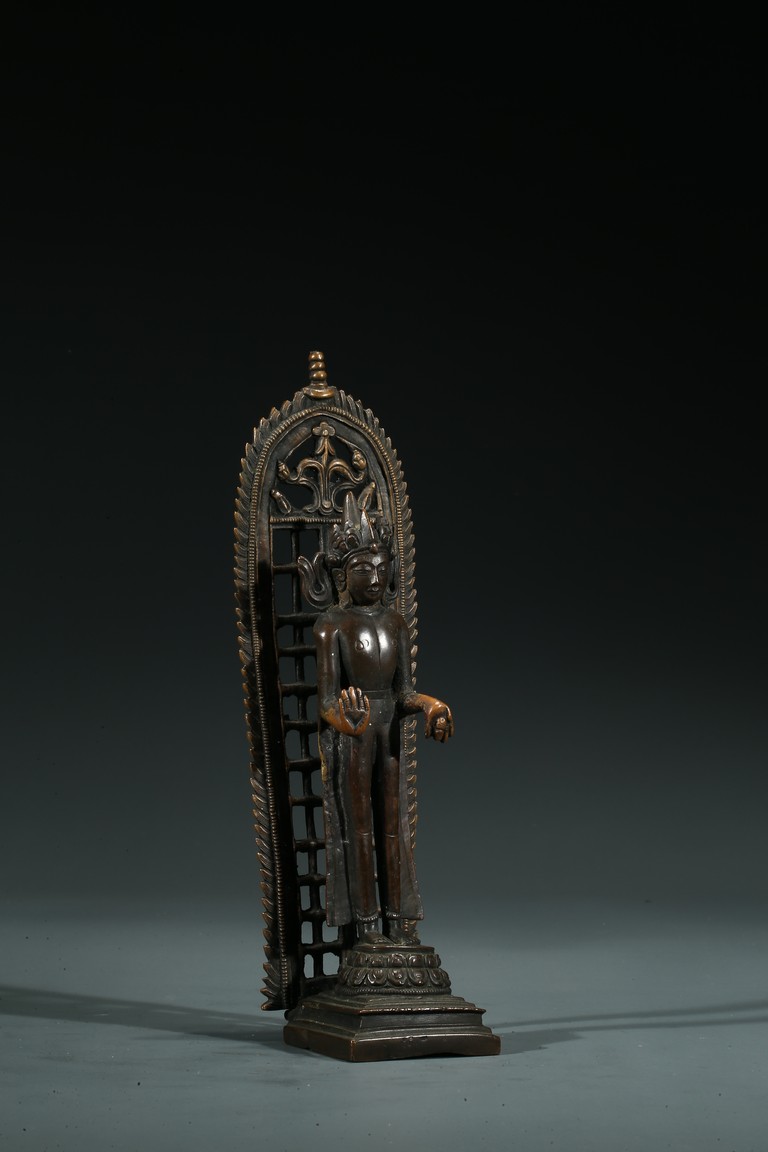 此尊釋迦牟尼立像造型莊嚴而富有神韻,釋迦牟尼佛頭戴五葉冠,跣足站立,右手上舉施無畏印,左手結與願印,面容沈靜,雙目低垂,身披通肩式袈裟,輕薄無飾的袈裟展現出整個造像的美感,除口緣和下擺以刻線表示外,似乎不著一縷,這種風格使得軀幹與四肢的曲線更加突顯。尤其是腰肢到腿部,如同流水般的曲線。整尊造像以合金銅整體澆鑄,銅質瑩潤細膩,包漿古樸厚重,背光保存完好,年代久遠而具有十分獨特的藝術氣韻。