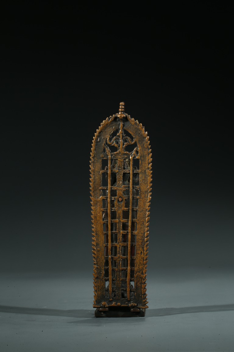 Circa 13th century. Myanmar. Cast with a standing bodhisattva upon lotus throne before a latticed aureole surmounted by a stupa, figure displays the attitude of reassurance with a calm, attractive smile.