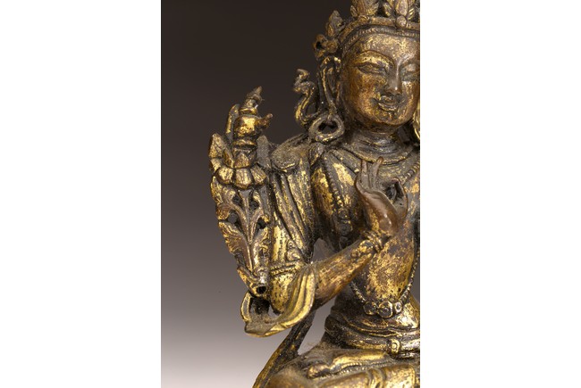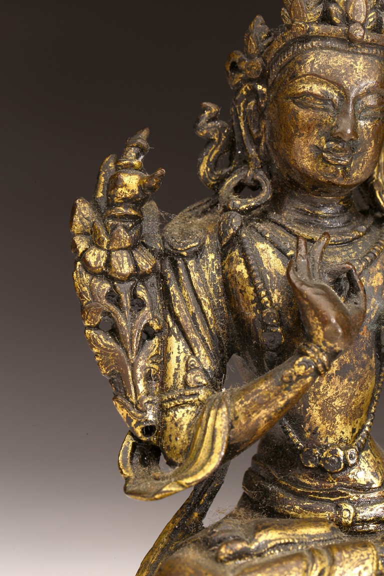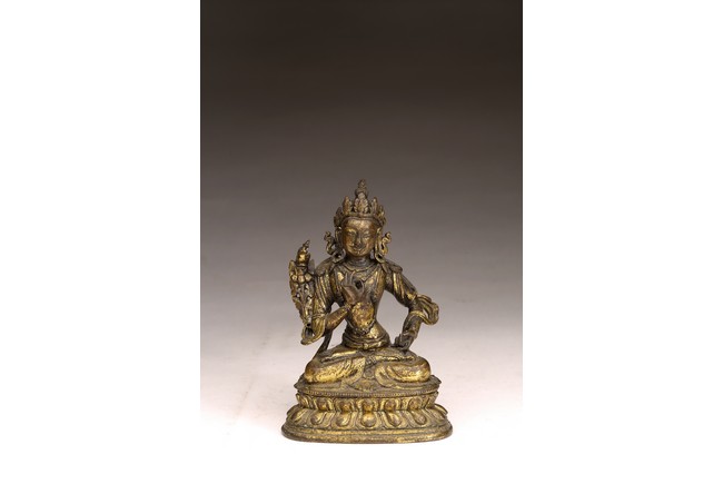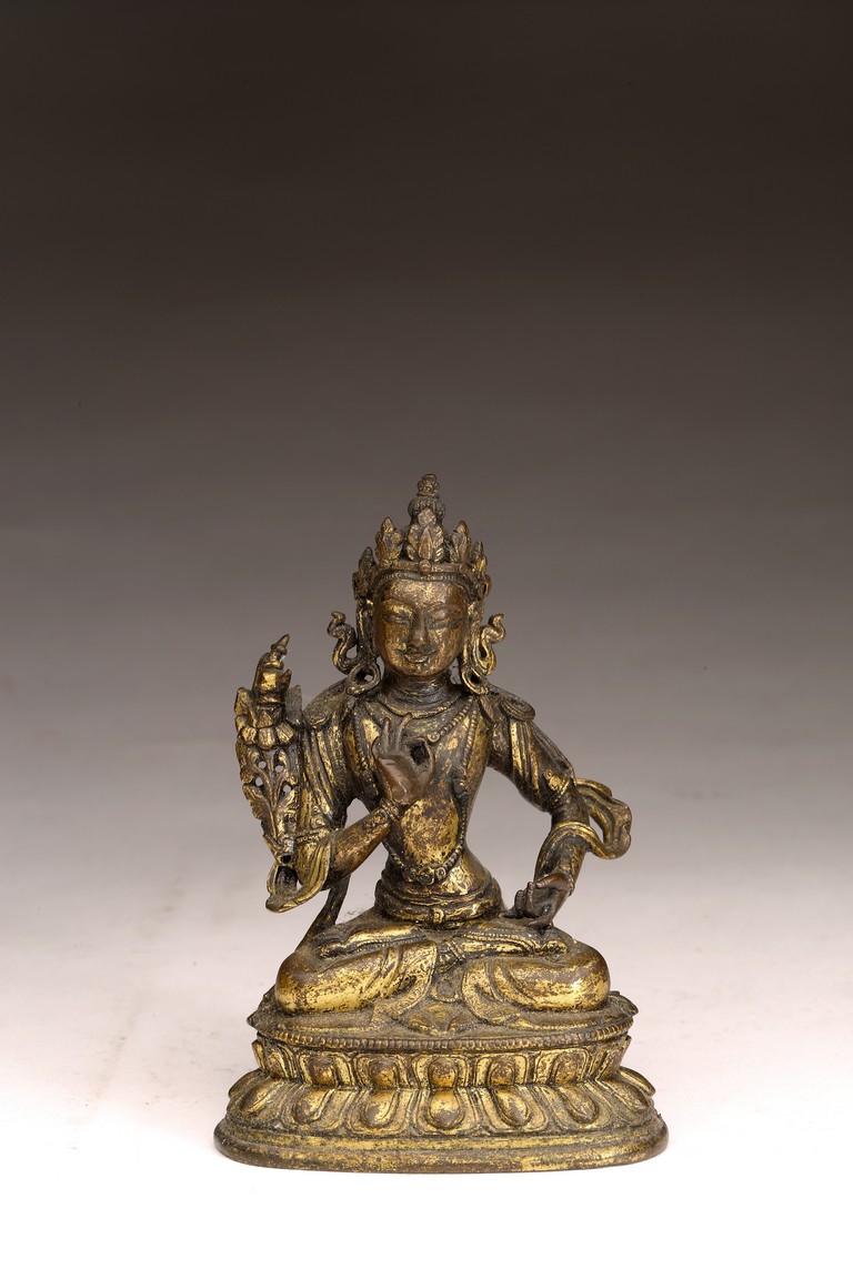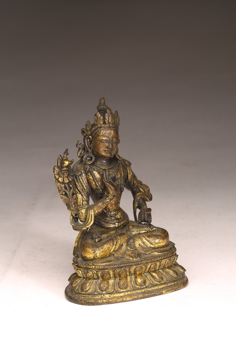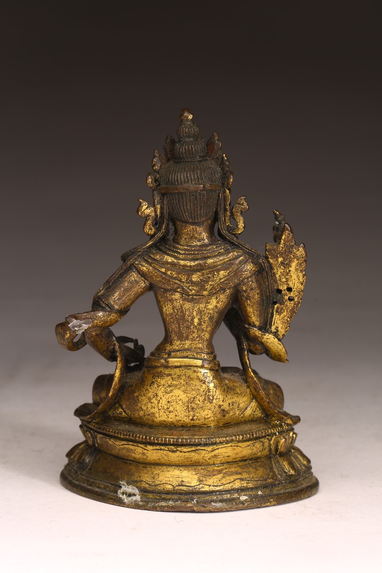 Qing Dynasty period. Cast seated on a double lotus base, the left hand lowered in varada mudra and the right hand raised to the chest, dressed in a dhoti embellished with beaded jewellery, crowned with a tiara in front of the high chignon