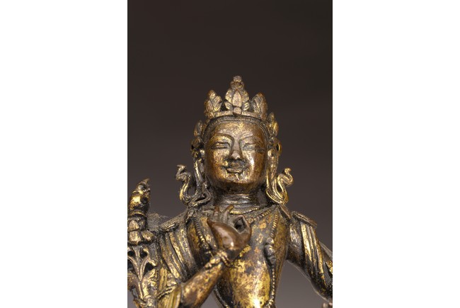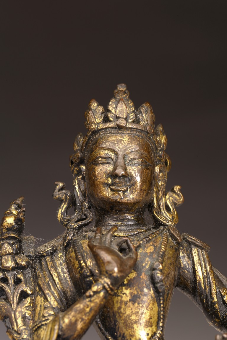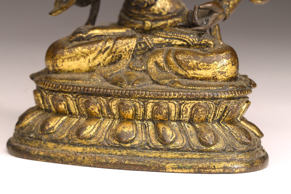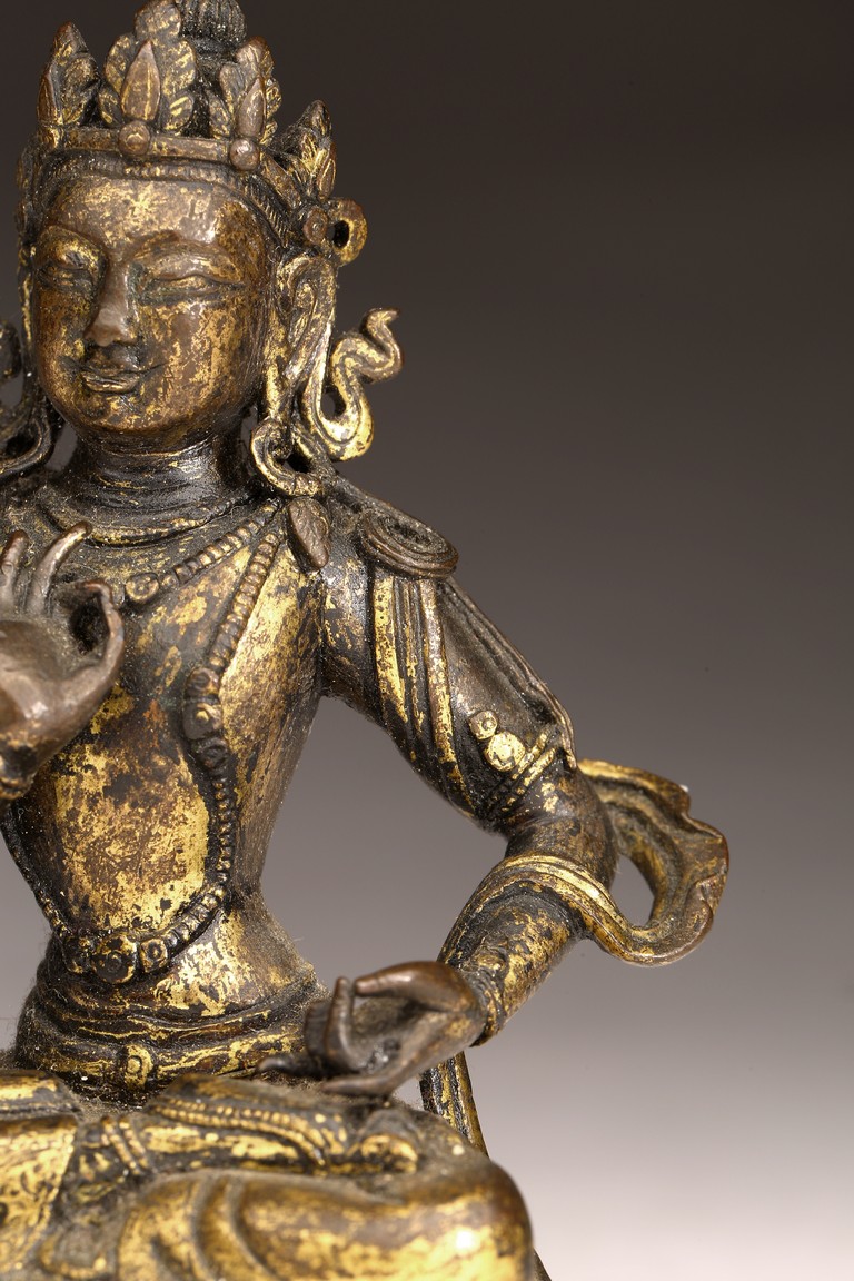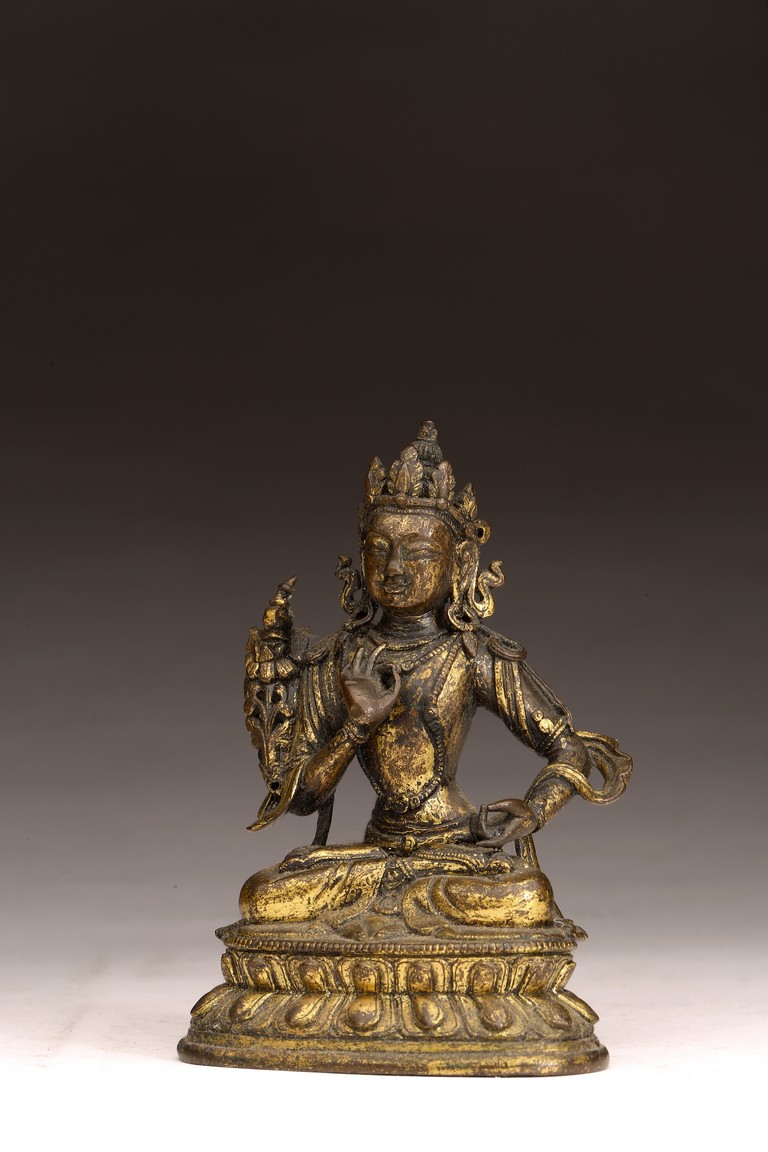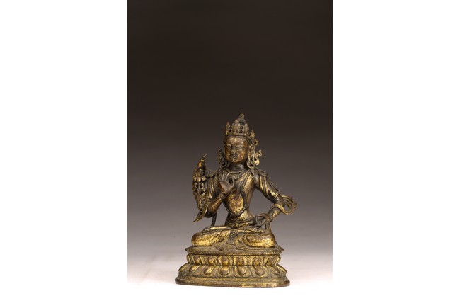 Qing Dynasty period. Cast seated on a double lotus base, the left hand lowered in varada mudra and the right hand raised to the chest, dressed in a dhoti embellished with beaded jewellery, crowned with a tiara in front of the high chignon
