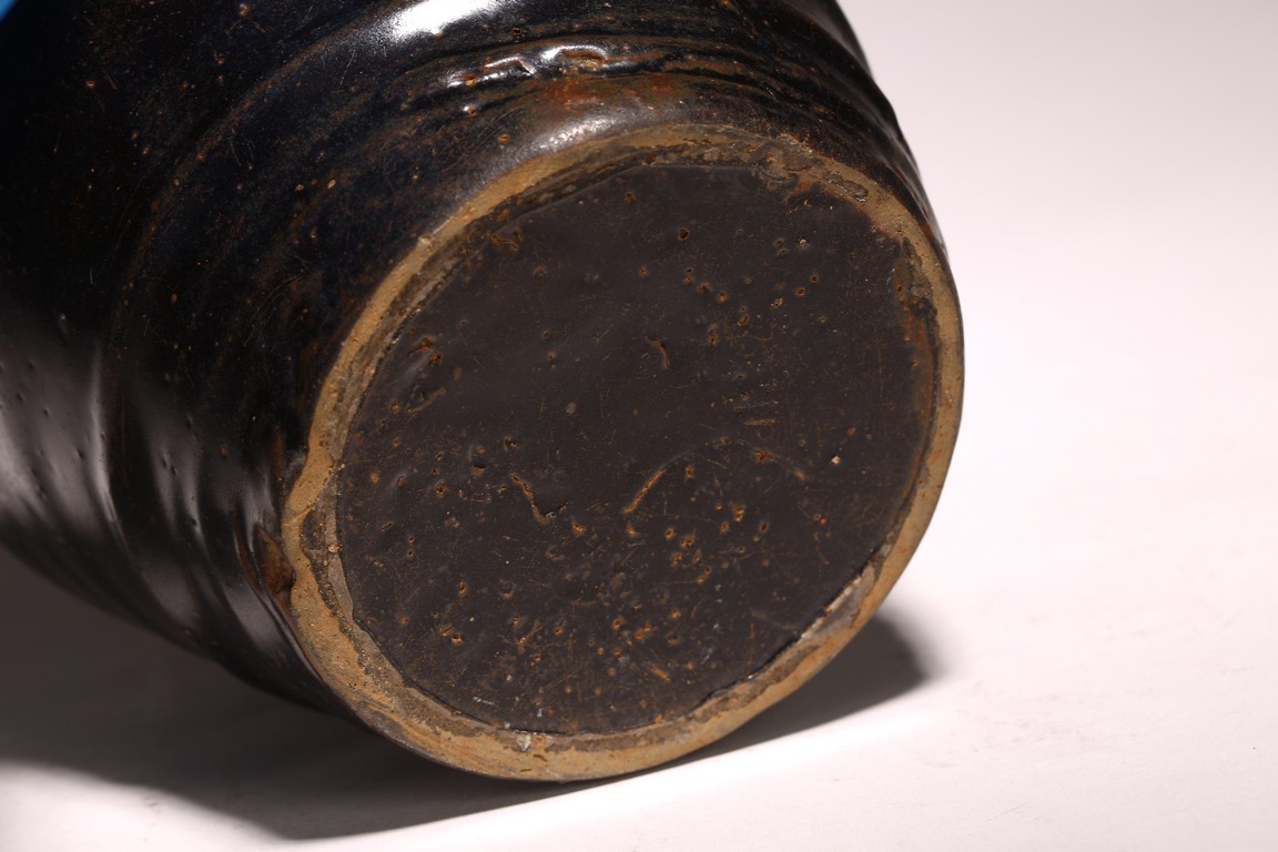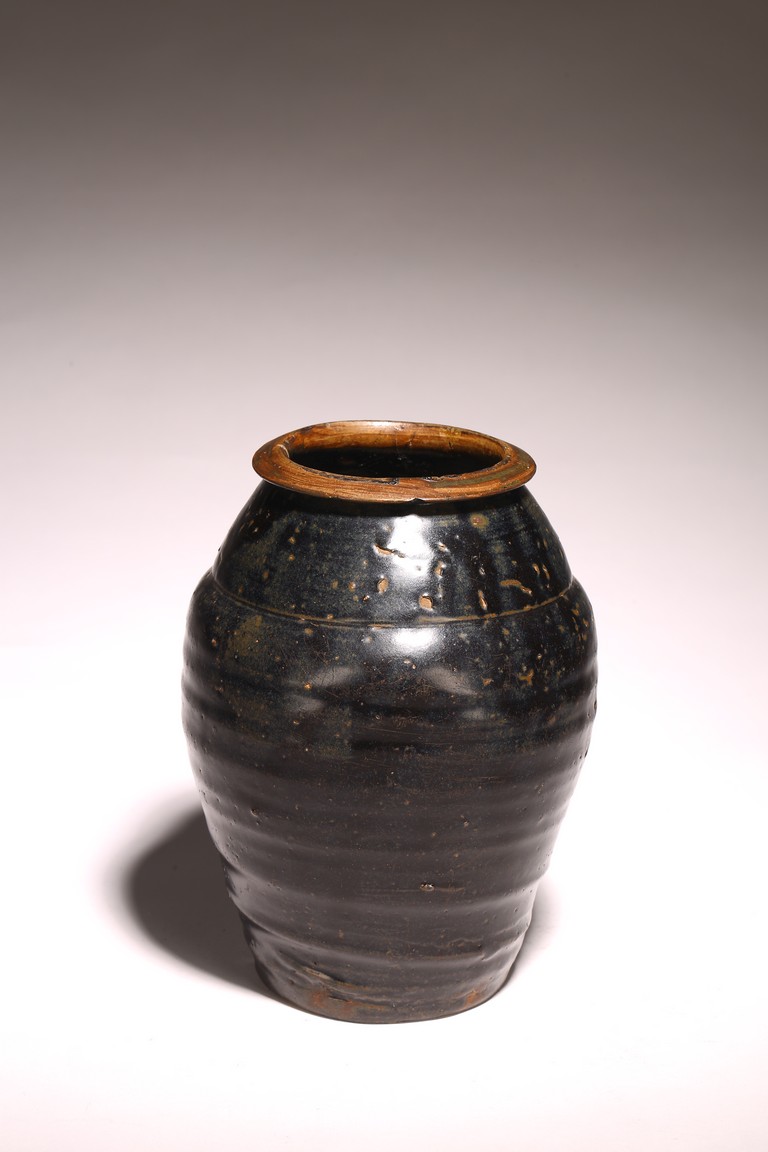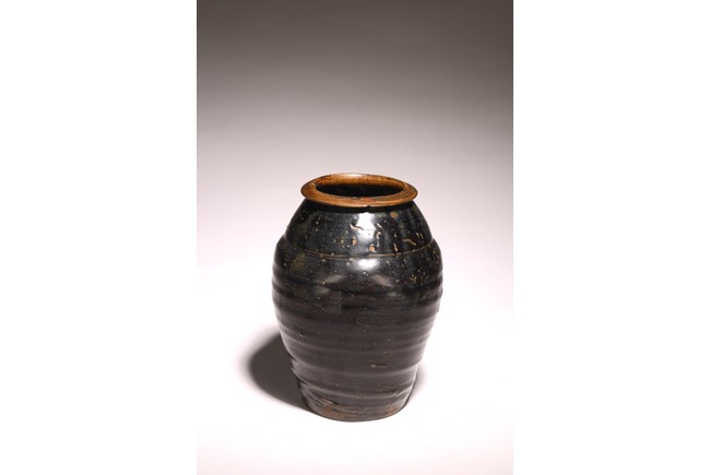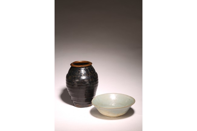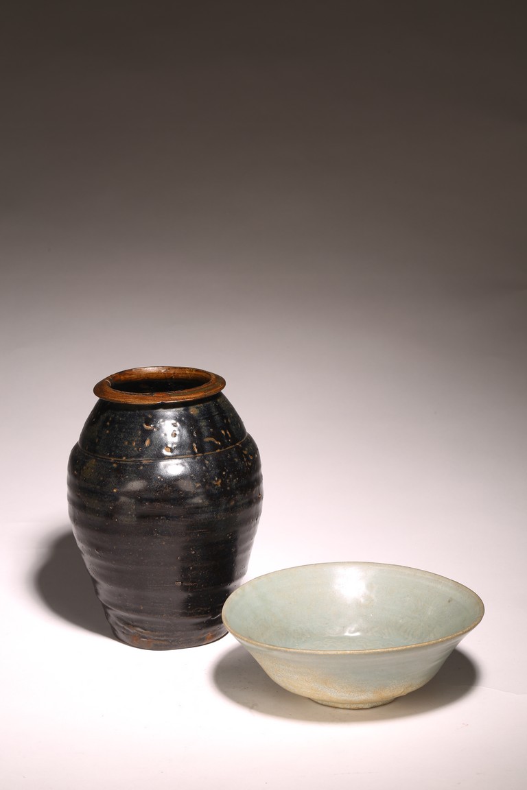 18th century or earlier. The Korean Henan style jar is of ribbed tapering form with high shoulder rising to lipped rim, overall applied with thick black glaze; the longquan bowl moulded with flower bloom surrounded by foliage pattern.