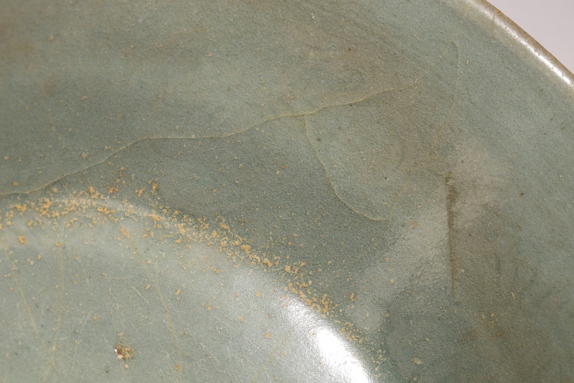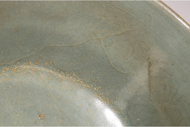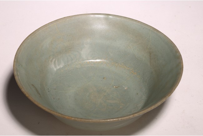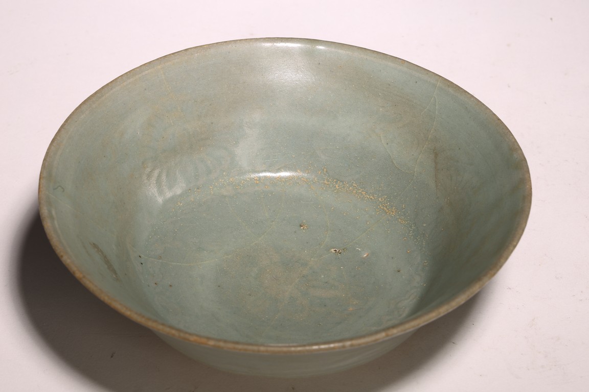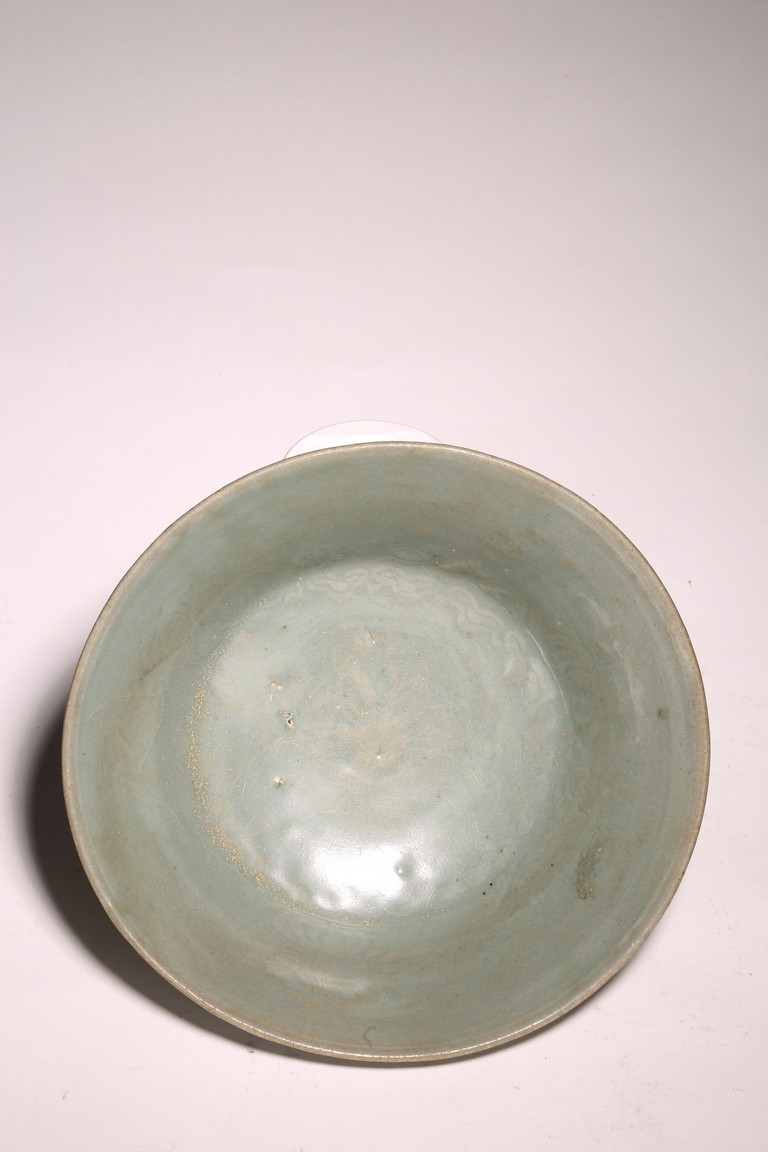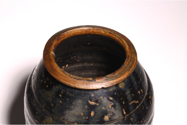 18th century or earlier. The Korean Henan style jar is of ribbed tapering form with high shoulder rising to lipped rim, overall applied with thick black glaze; the longquan bowl moulded with flower bloom surrounded by foliage pattern.