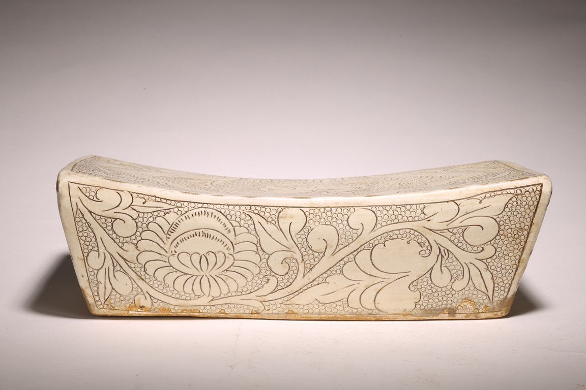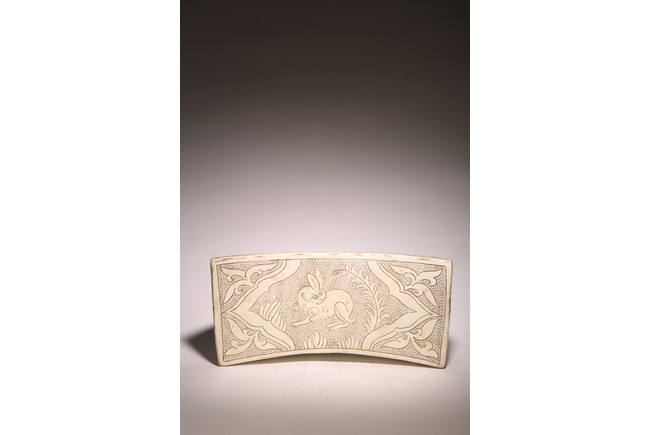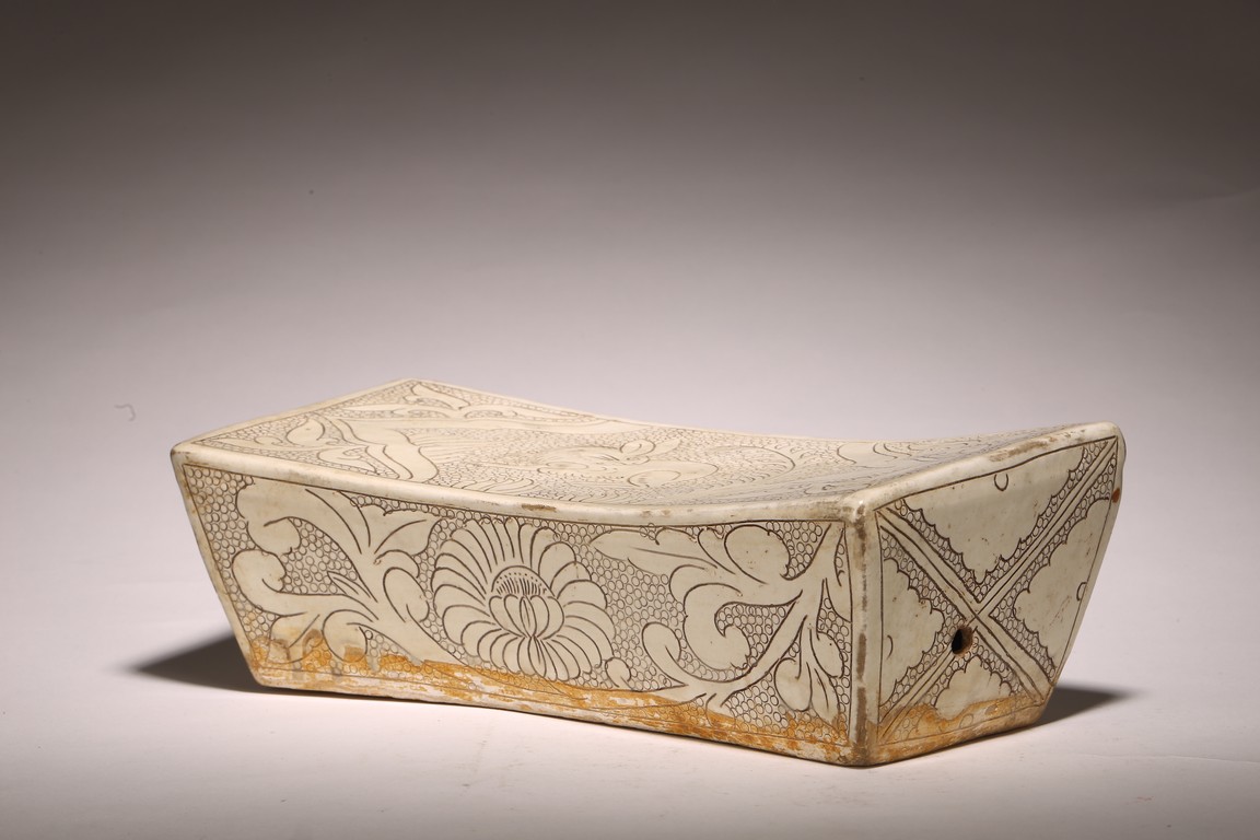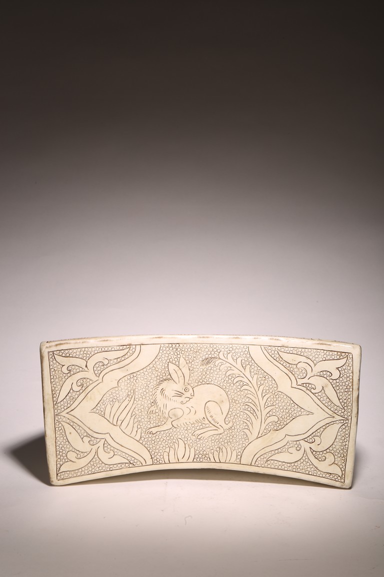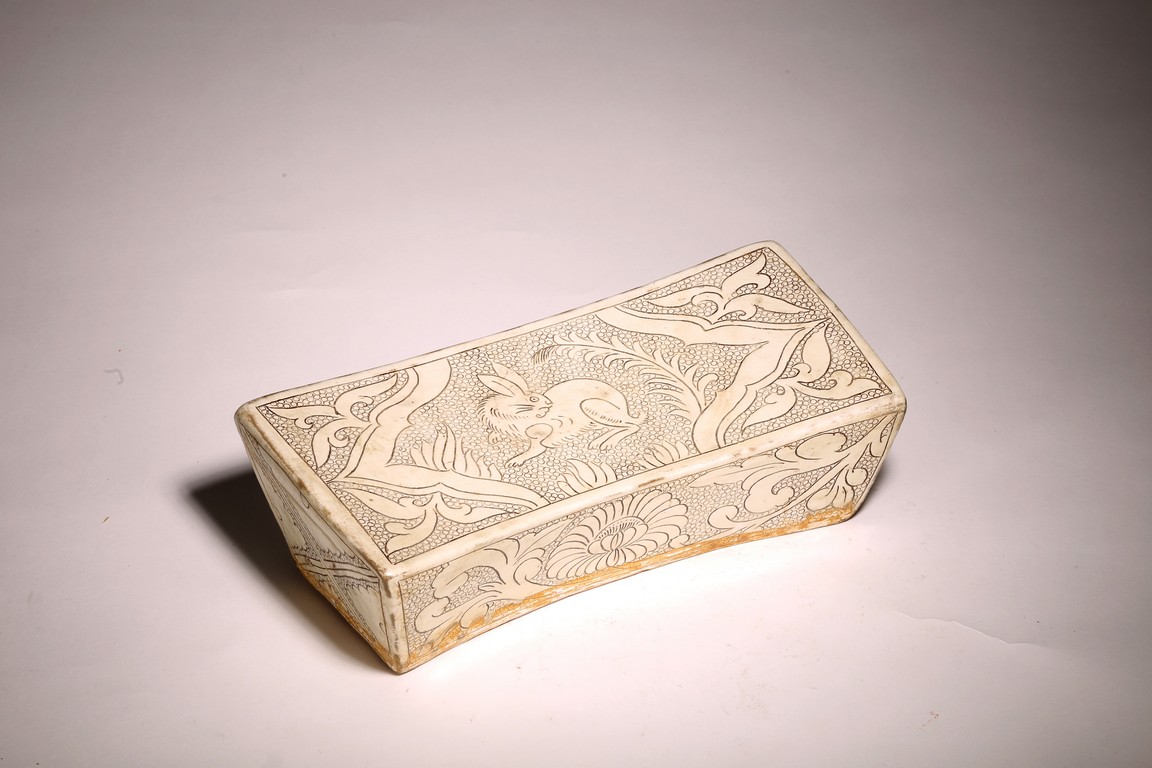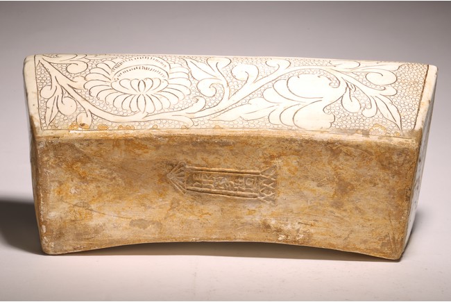 Song Dynasty period. Of tapered rectangular shape, the sloping top finely carved in a brown slip with a rabbit with head sharply turning back, the sides further decorated with large flower heads and leafy branches, the unglazed base impressed with a three character mark.