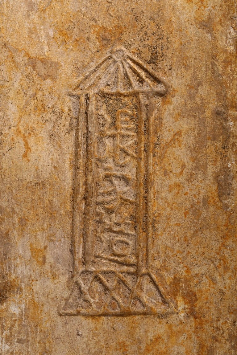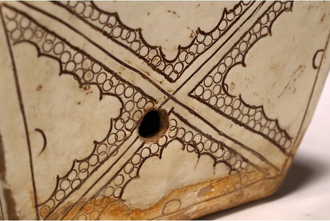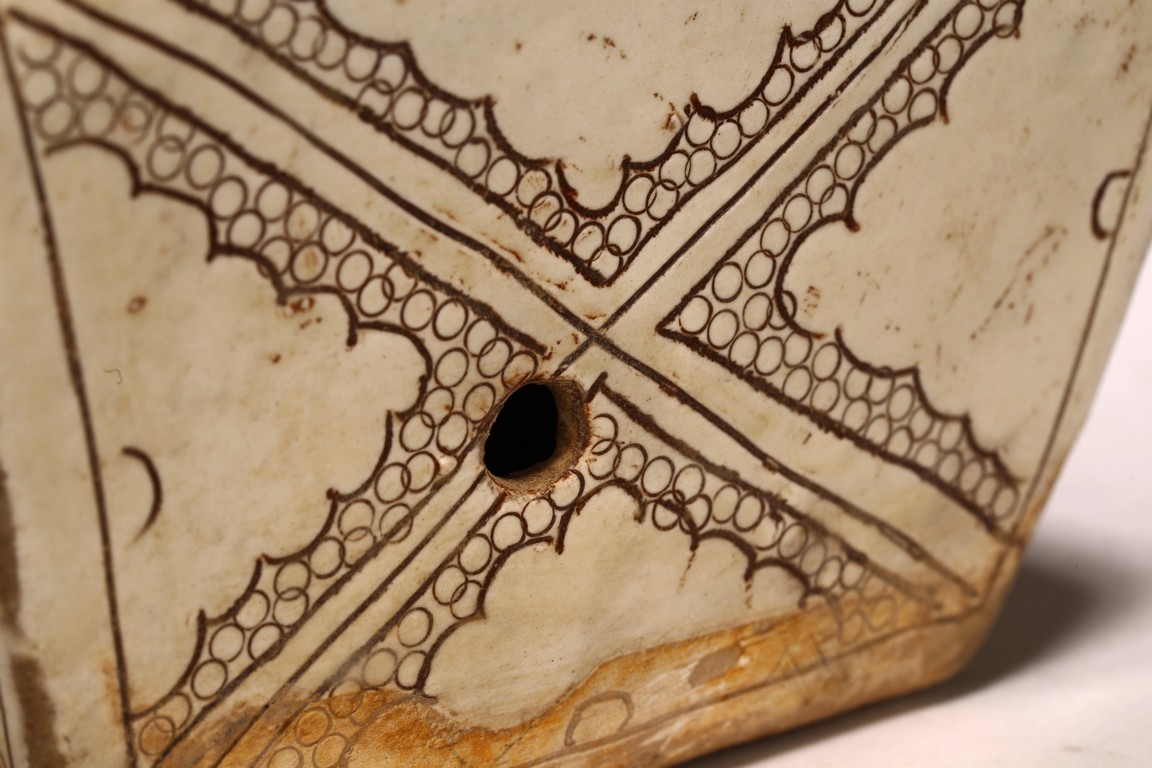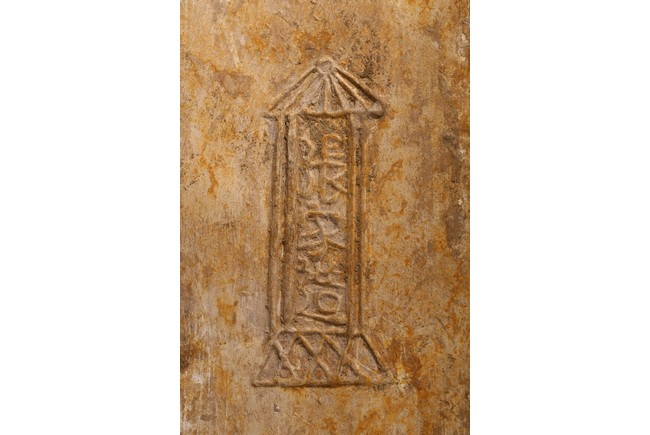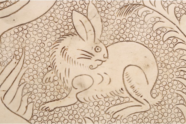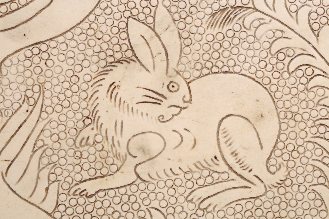 Song Dynasty period. Of tapered rectangular shape, the sloping top finely carved in a brown slip with a rabbit with head sharply turning back, the sides further decorated with large flower heads and leafy branches, the unglazed base impressed with a three character mark.