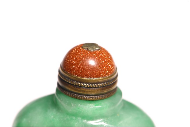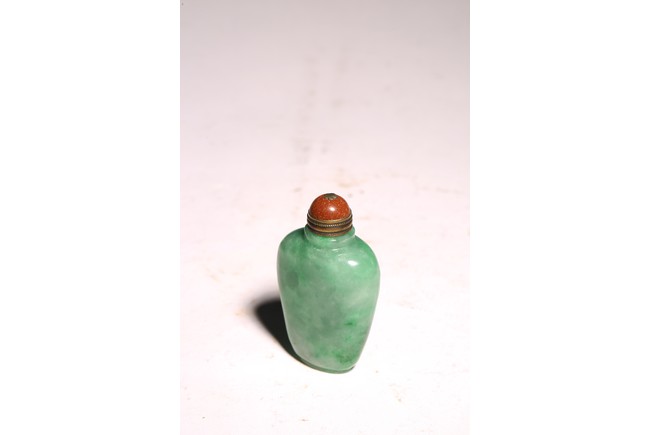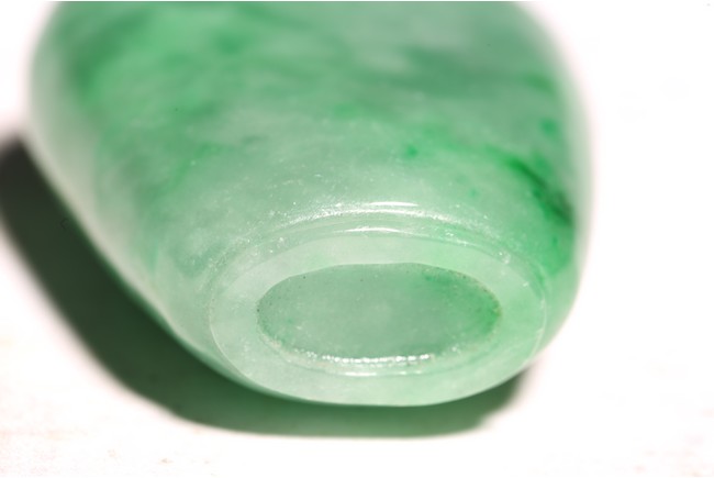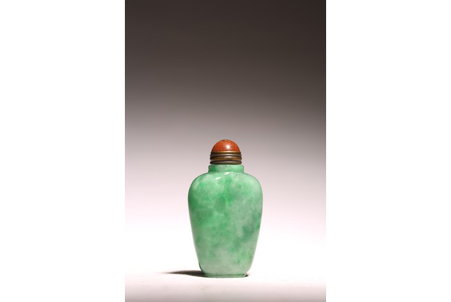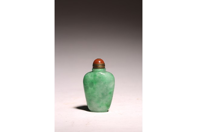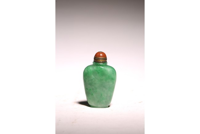 短口,鼓腹下收,圈足。翡翠製成,顏色翠綠,水頭充足。