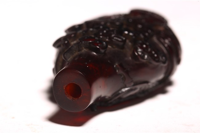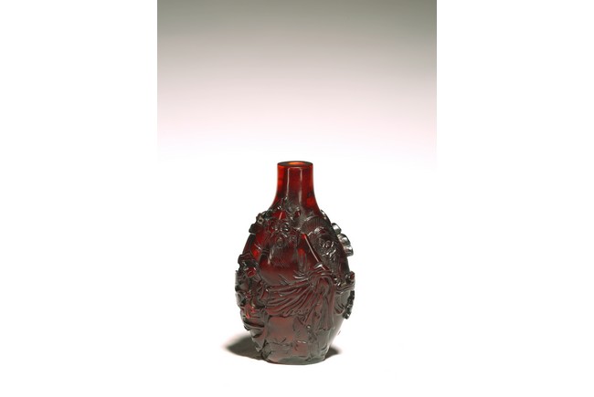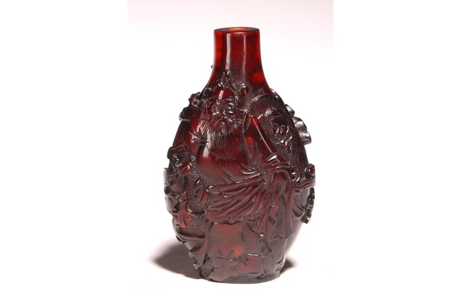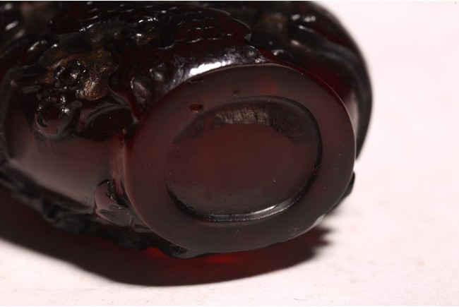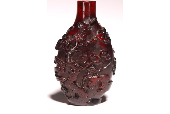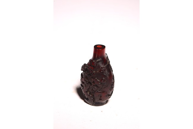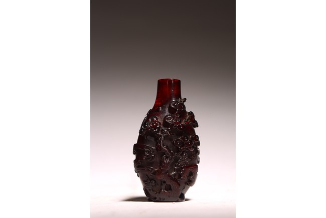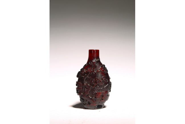 此件器物為紅料製成,純淨無暇,流光溢彩,顏色鮮豔。口微侈,頸瘦長,鼓腹下收,圈足。線條舒緩優雅,器身浮雕“松樹”,雕刻細緻,製作精美。 來源:聖何塞私人收藏 Provenance: Property from a San Jose private collection