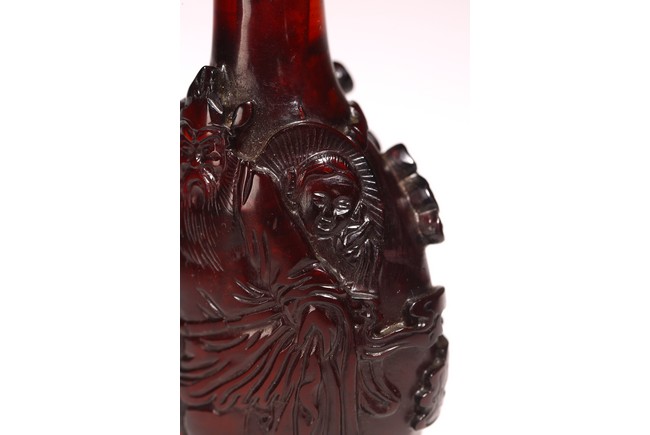 Chinese. Of pear shape, carved around the body with classical figures and pines in high relief, stopper missing. Qing Dynasty period.
