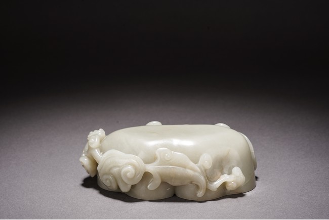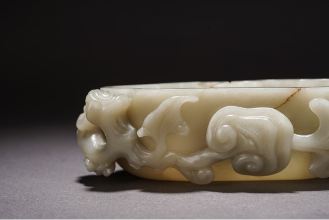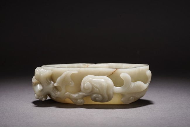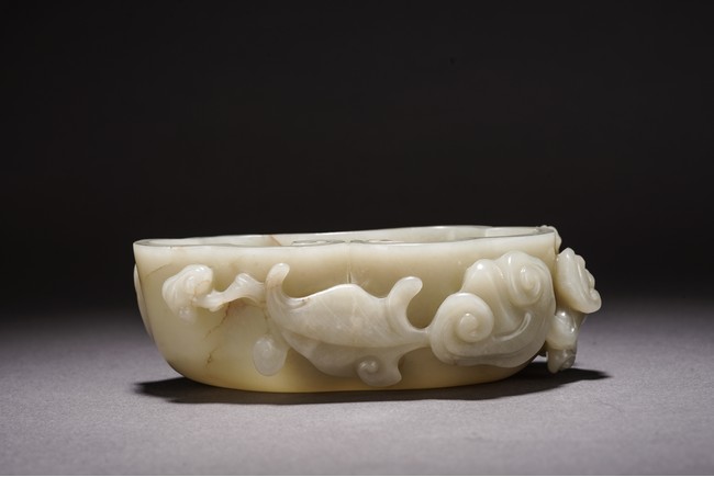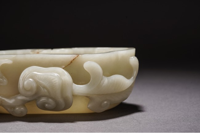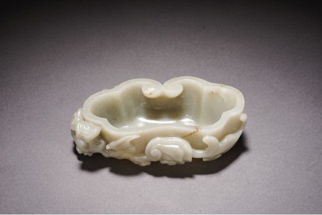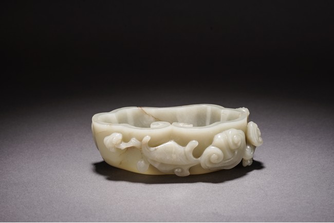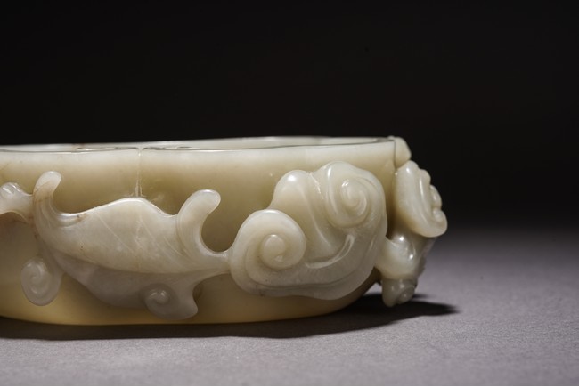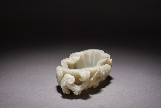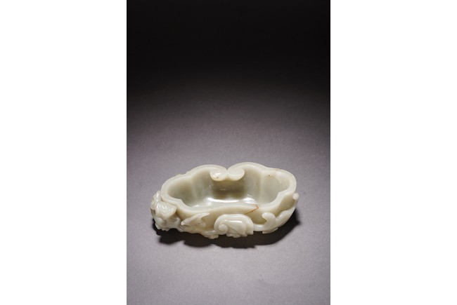 此件器物由白玉雕琢而成,玉質潔白細潤,奪人眼目。筆洗平底,直壁,作靈芝狀。外壁浮雕靈芝,線條簡潔明快,雖造型簡單,但設計精巧,頗見功力。