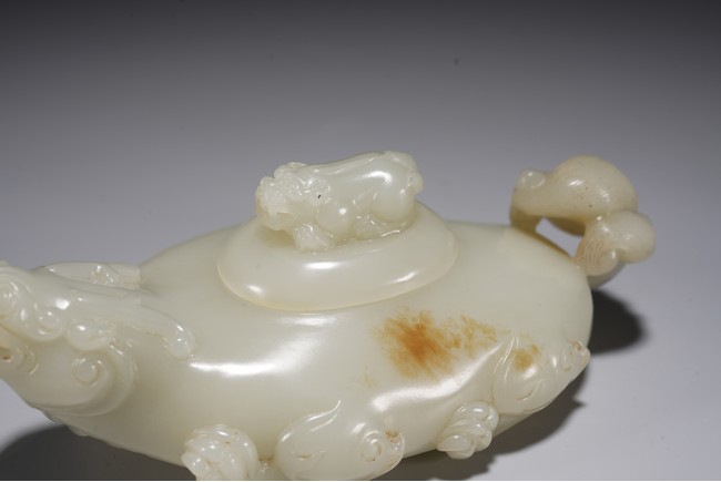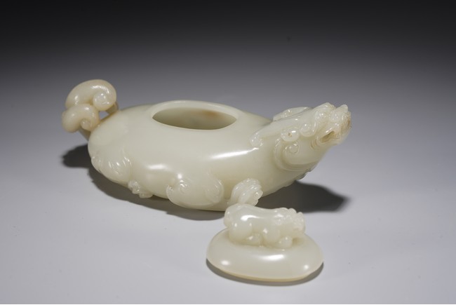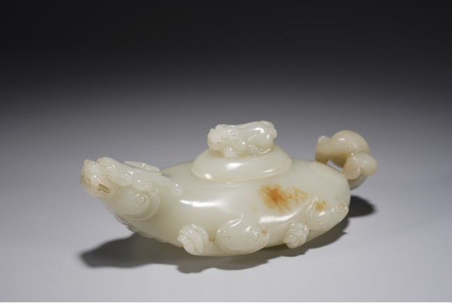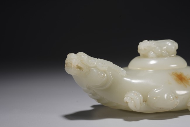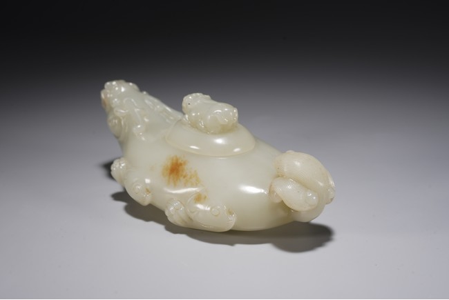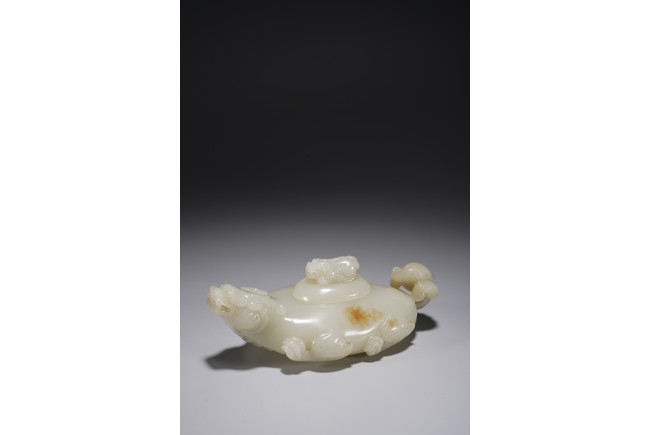 Chinese. The censer carved in the form of a mythical beast, with oval-shaped body, the beast spout and tails as handles, fitted with cover surmounted with a smaller mythical beast, the polished celadon white stone with russet skin.