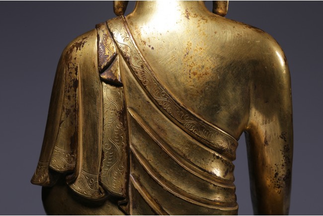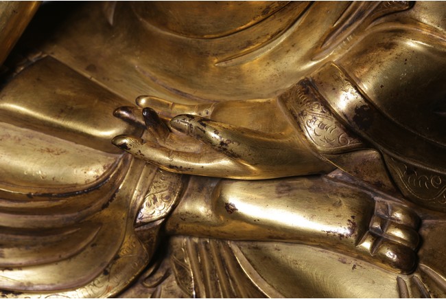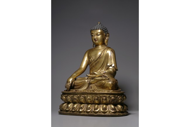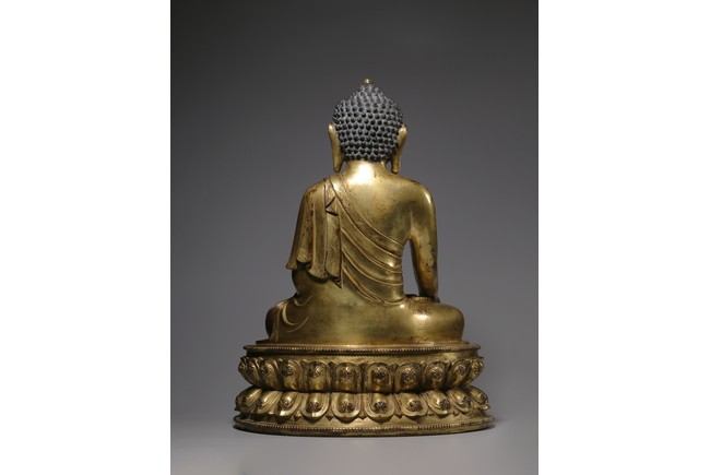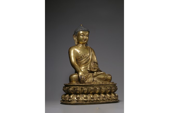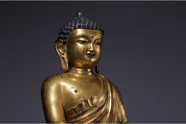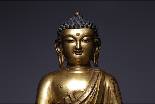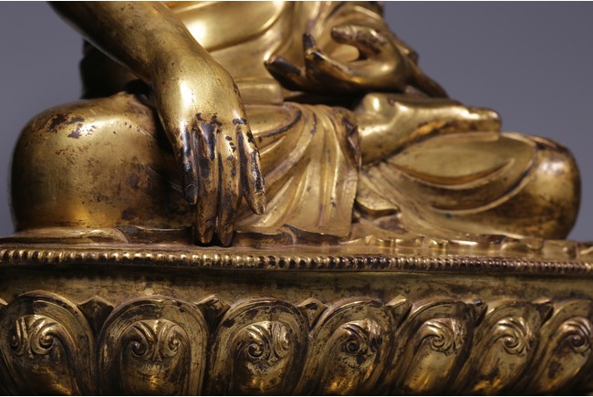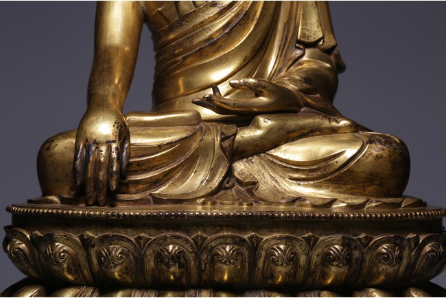 釋迦牟尼佛,本是古印度迦毘羅衛國的太子,屬剎帝力種姓。父為淨飯王,母為摩耶夫人, 佛為太子時名叫“喬達摩•悉達多”,意為“一切義成就者”。後苦修成佛,釋迦牟尼的意 思是“能仁”、“能儒”、“能忍”、“能寂”等,因父為釋迦族,成道後被尊稱為釋迦牟 尼,義即“釋迦族的聖人”。此尊造像表現了佛陀最經典的釋迦牟尼佛成道像,象徵著世尊菩提樹下禪坐冥想、降服魔羅、最終成就正等正覺。鎏金飽滿,色澤沉靜;肉髻高聳,寶珠頂嚴,頭飾螺發,排列整齊, 有紺藍塗飾。相容和煦,天庭飽滿光潔,眉如初月,雙目沉靜似水,雙唇飽滿,嘴角微揚, 流露出無限智慧和寬廣的慈悲。眉間飾珍珠白毫,猶如琉璃筒一樣,光明遍照整個宇宙虛空。左手置於腹前結禪定印;右手下垂結觸地印,表現的是釋迦牟尼佛在菩提樹下戰勝魔軍,大 徹大悟、圓滿成佛的重要時刻。著袒右肩式袈裟,薄如蟬翼,衣紋華麗精美,轉折起伏自然 流暢,雙腳結全跏趺坐安坐雙層束腰仰覆蓮瓣之上。雙重蓮瓣大小相迭,狹長秀美,蓮台上 下沿均裝飾連珠紋,下沿連珠緊貼底部,形成“落地珠”,珠形古樸,別有意趣。整尊造像 造型大氣,體量巨大,實屬罕見珍貴,肌肉的刻劃,袈裟紋飾的寫實化處理,使得佛陀像於古樸中透出一種大度的氣勢,而寬大、精美的底座為佛像增加了雍容華貴之美。工藝精湛, 製作考究,展現出渾厚的雕塑之美,具有重要的藝術價值和極高的宗教價值。 來源:加州洛杉磯私人收藏 Provenance: Property from an private collection, Los Angeles