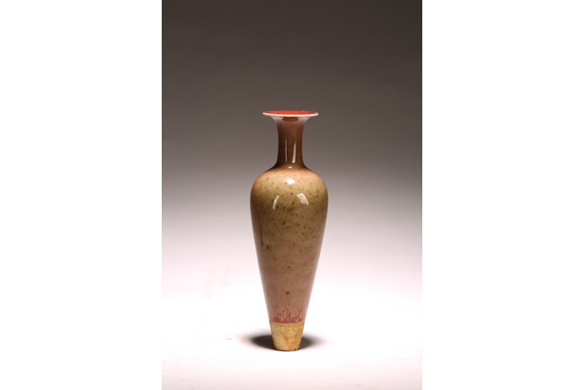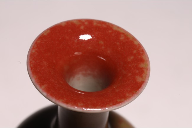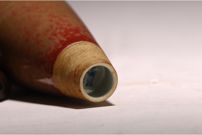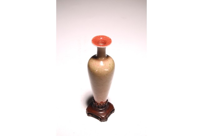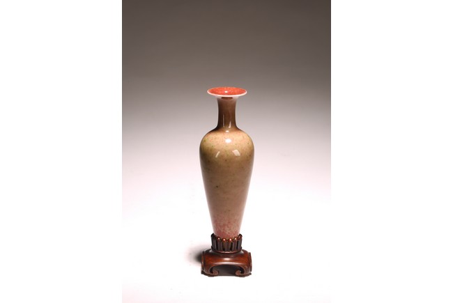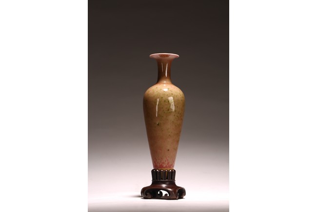 Chinese. The slender tapered body with rounded shoulders rising to a tall flared neck, covered overall in a mottled peach bloom red glaze, the interior applied with a similar pinkish glaze, the lip and deeply recessed base glazed white, the base with a six-character mark in underglaze blue in two columns, fitted with rosedwood stand. Qing Dynasty Kangxi period.