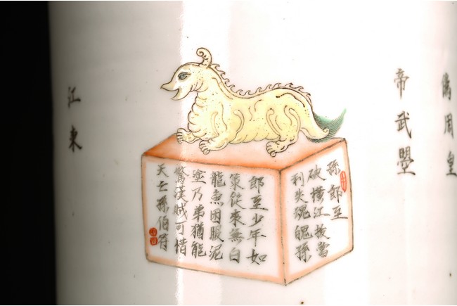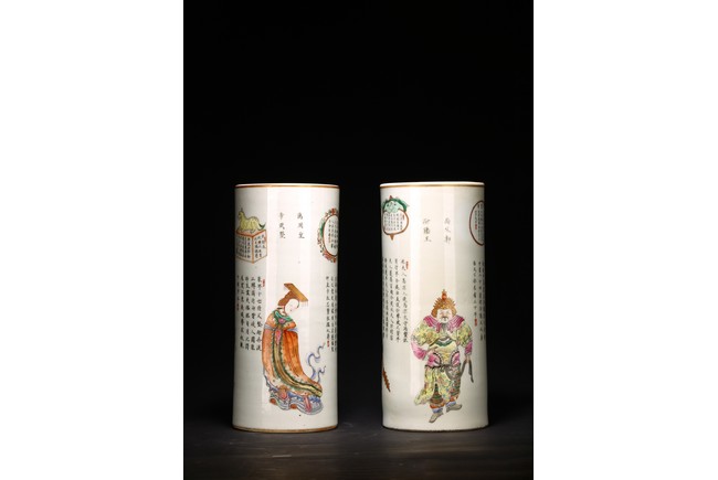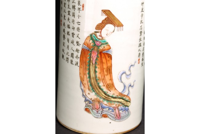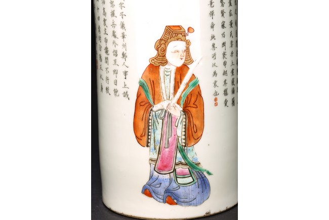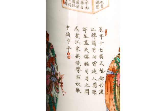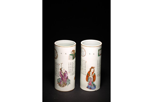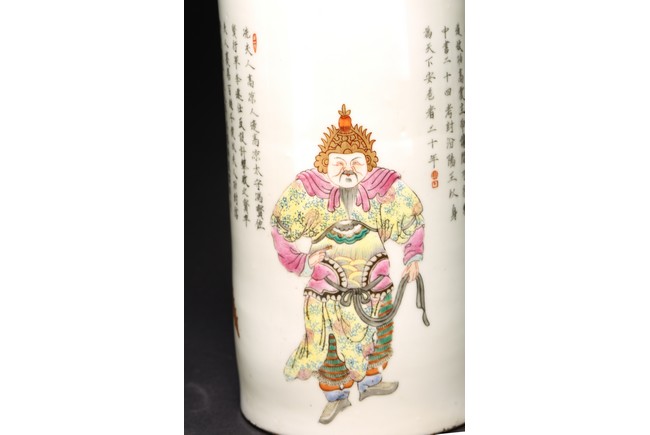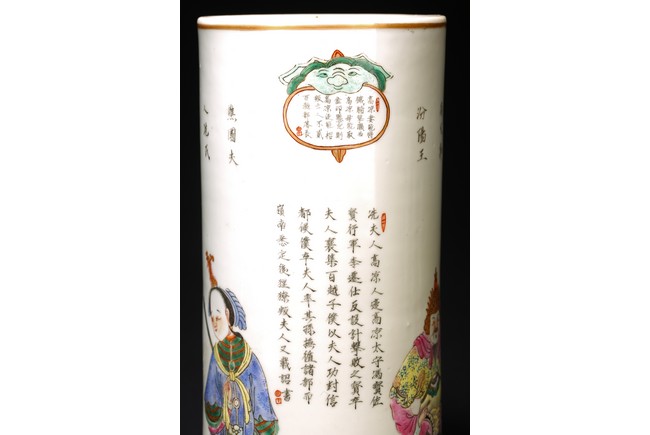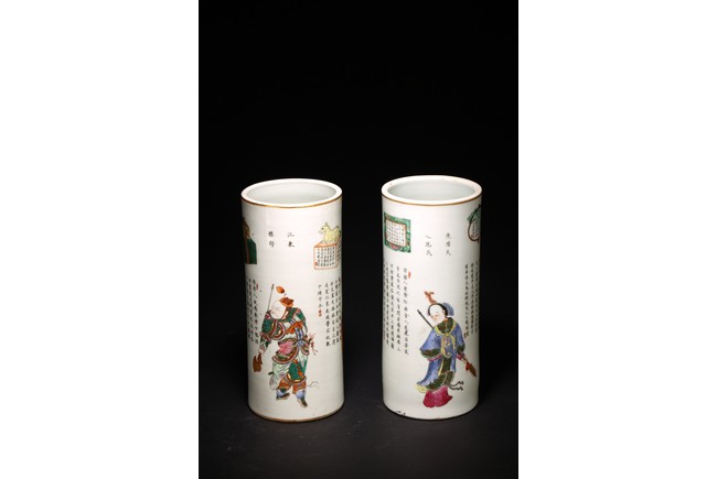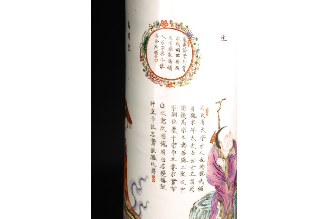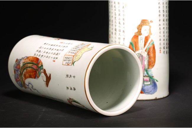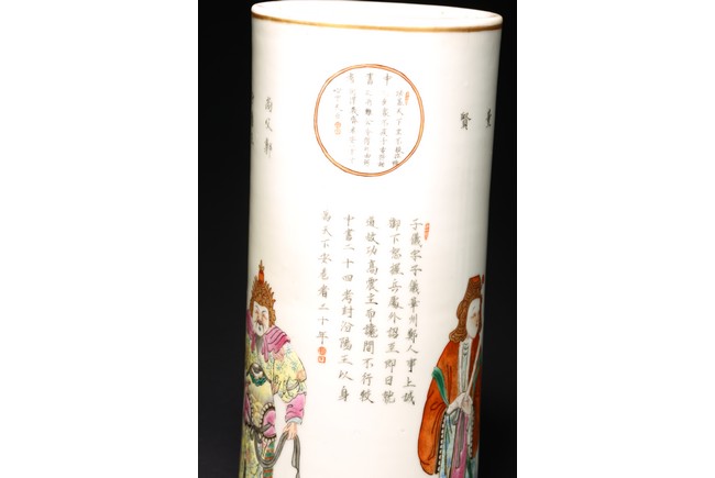 Chinese. Of cylindrical form, the exterior painted with historical figures and inscribed with their title, names, and stories, the top rim gilt, the base inscribed with reign mark. Late Qing Dynasty period.
