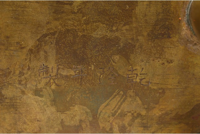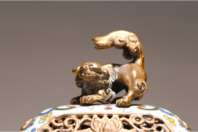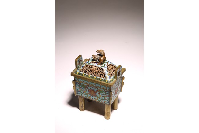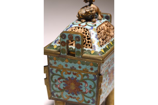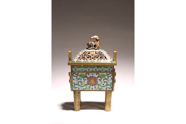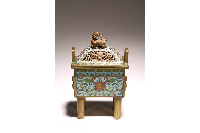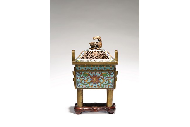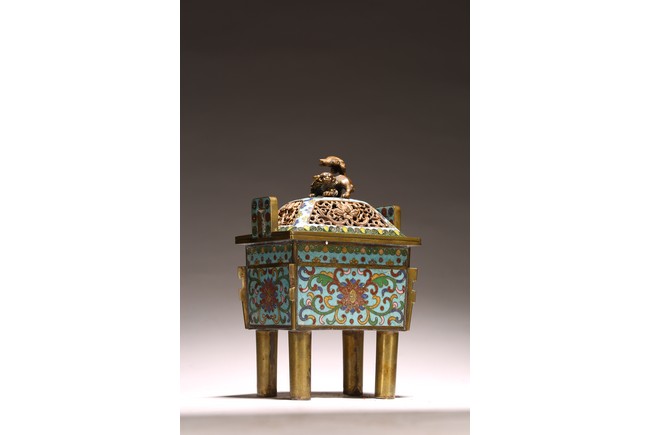 造型仿商周青銅禮器形制,作四足方鼎,器形古樸厚拙,上設寶蓋,蓋鈕為獅鈕, 通體以藍彩為地,嵌飾纏枝蓮紋,色彩妍麗堂皇,填塗嚴謹細緻,器表打磨光滑。 “乾隆年制”款識。 來源:密蘇裡州堪薩斯城私人收藏 Provenance: Property from a Kansas City, Missouri Family Estate