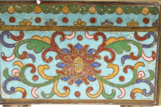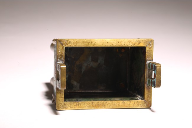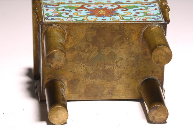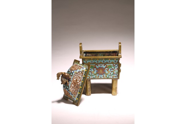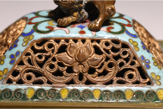 Chinese. Of archaistic fangding form of tapered rectangular section supported on four columnar legs, rising to the rim set with a pair of upright arched gilt handles, covered overall with a lotus scrolls reserved on a turquoise ground, the four character mark incised on the base, the sloped-roof cover with a playful lion, hardwood stand. Qing Dynasty period.