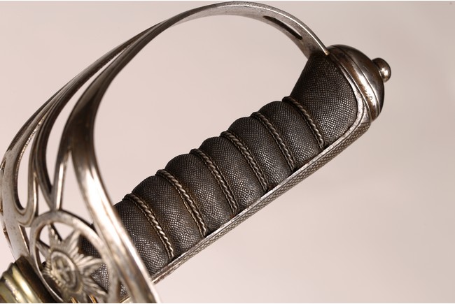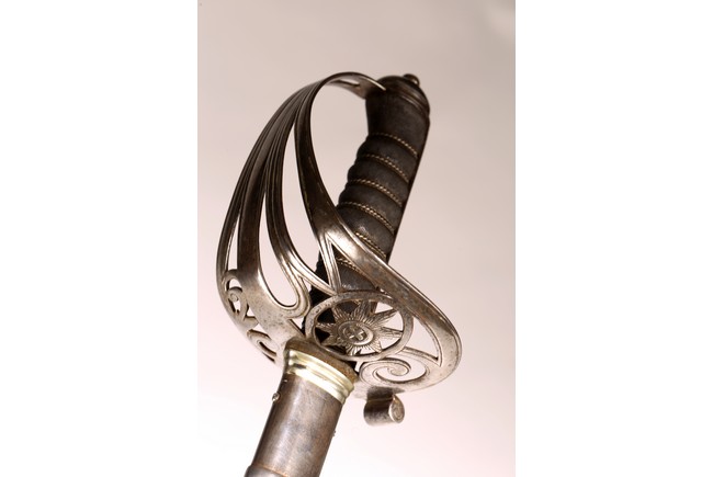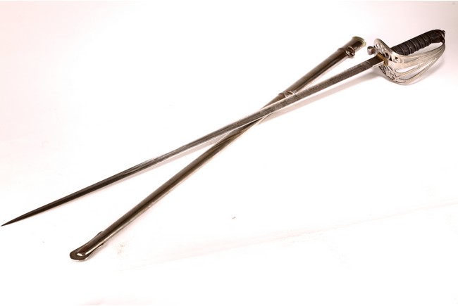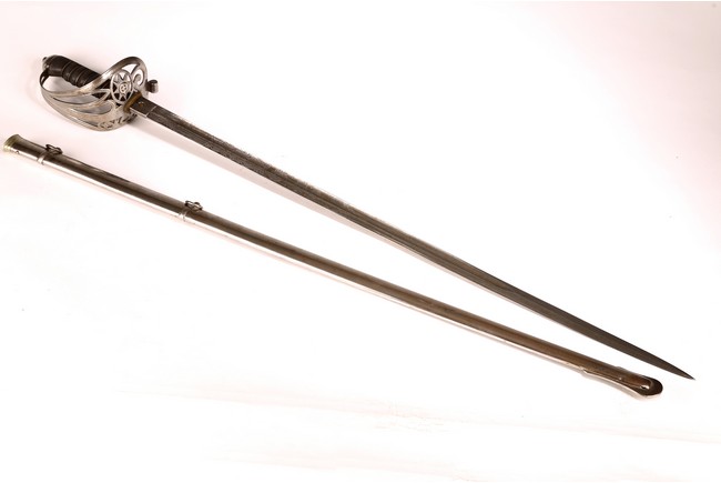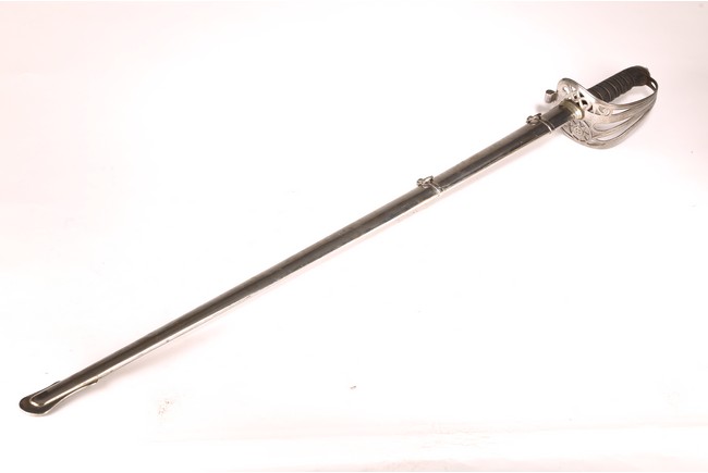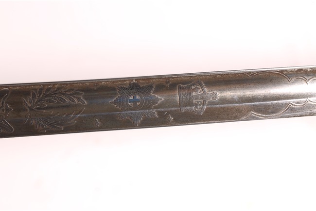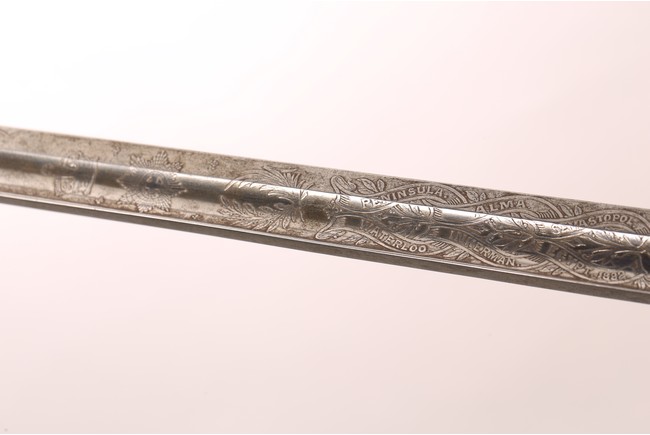 British. 19th Century. The blade decorated with inscriptions reads 'Peninsula','Alma',' Sevastopol','Waterloo','Inkerman','Egypt 1992', with scabbard.