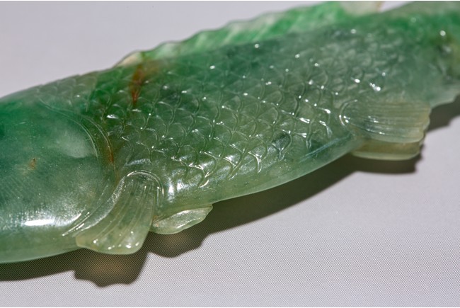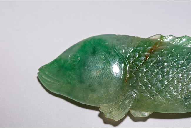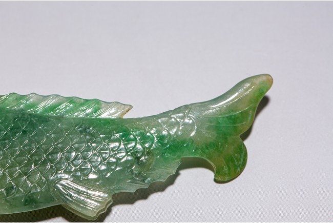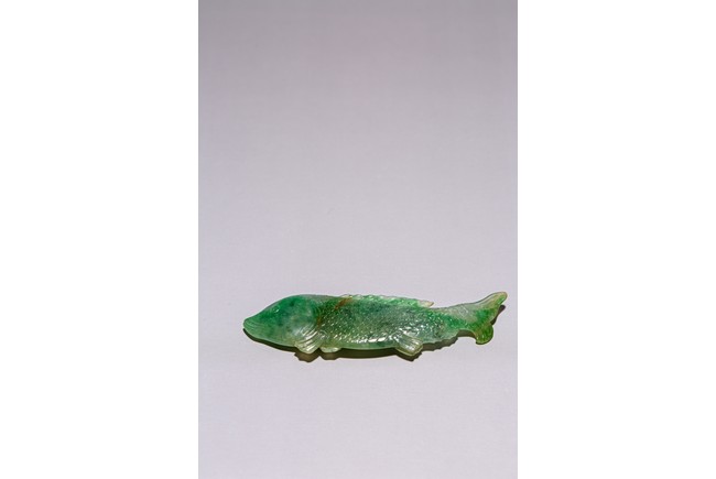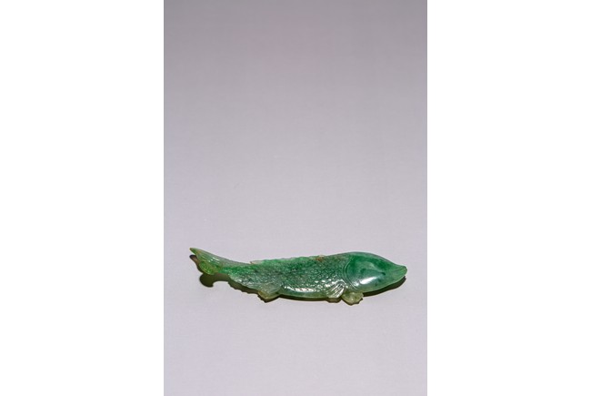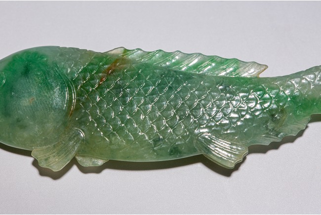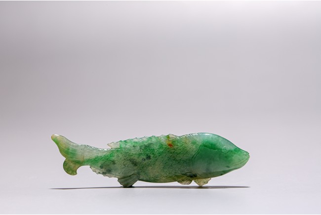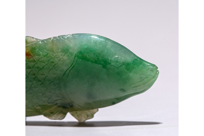 Chinese. Carved to depict a carp. The stone is of translucent apple and emerald green tone. Qing Dynasty period.