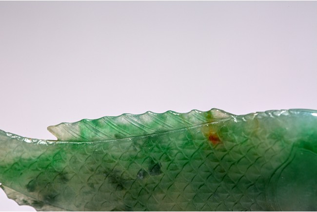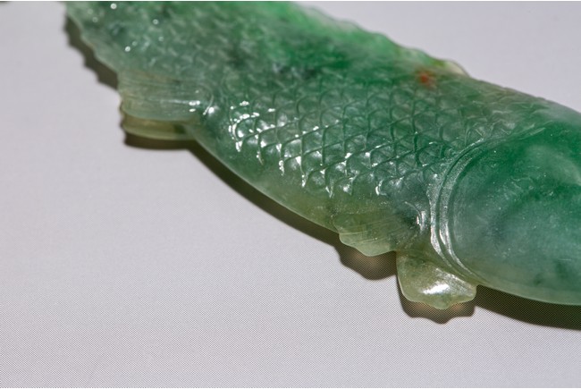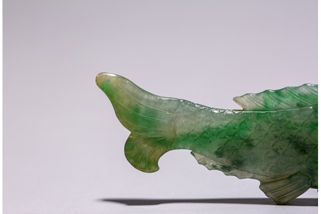 翡翠俗稱硬玉,主要產於緬甸,緬甸翡翠以其充滿生機的青翠與碧綠的特點開始 受到皇家重視,迅速走進了王公貴族的審美視野。此件翡翠魚濃艷深沉,水頭充足,種水皆佳,色澤通透,青綠宜人,玻璃光澤強,盡顯晶瑩剔透之感。魚身細長,厚實飽滿,魚鱗刻畫清晰,型態逼真,遊姿生動活潑,整體造型栩栩如生。 來源:重要紐約私人玉器收藏 Provenance: Property from an Important NYC private Jade collection