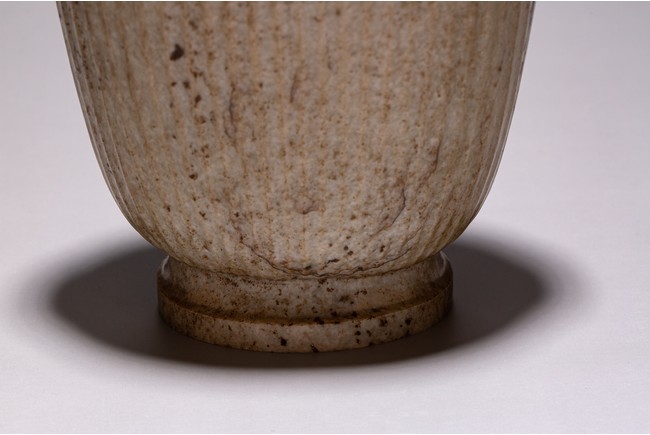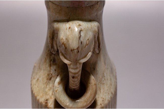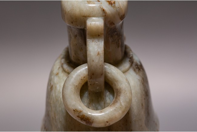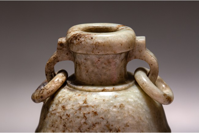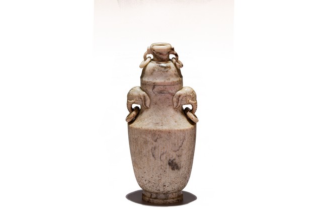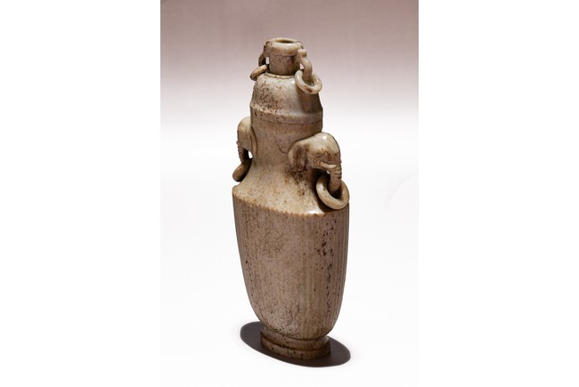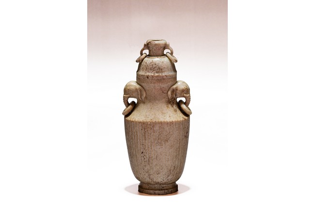 Chinese. The flattened body rising from a stepped foot to a waisted neck flanked by a pair of elephant handles suspending loose rings. Qing Dynasty period.