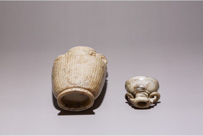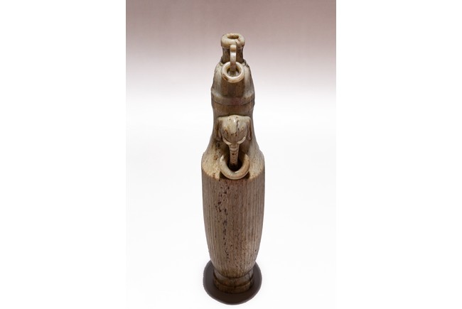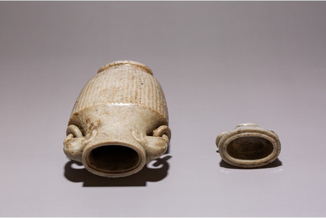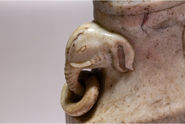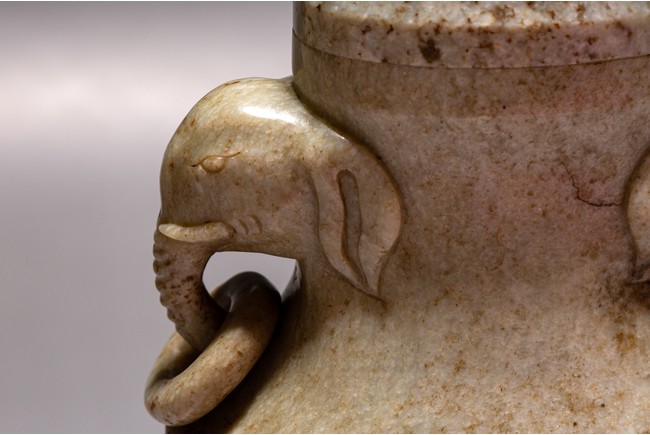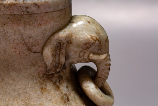 此瓶為慕古器物,造型取自古代青銅器,略帶黑褐沁色,束頸、豐肩、腹部內斂,帶 蓋,蓋頂置扁圓手抓鈕,左右銜環,工藝複雜,子母口,器身為扁圓型,兩側作象耳銜環, 造型規整大氣,太平有像,保佑國土四方平安,製作精良,造型端雅大方,厚重敦肅,當為宮廷內陳設佳品