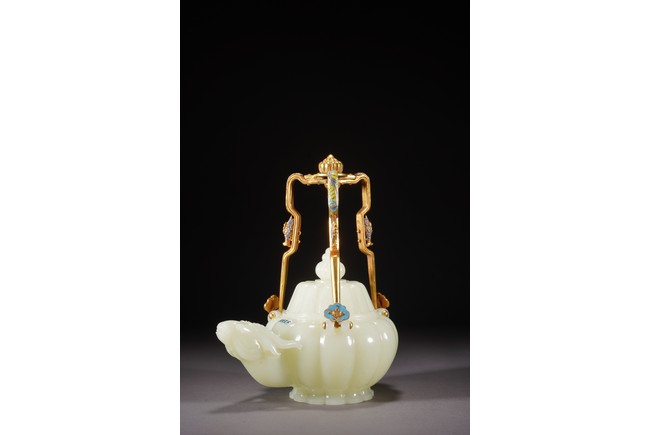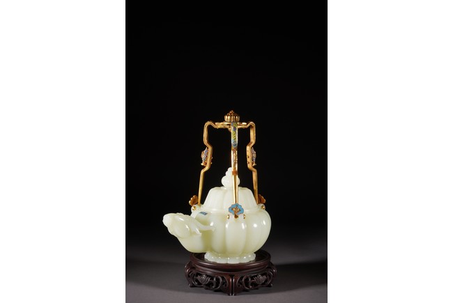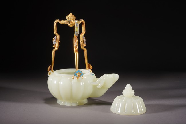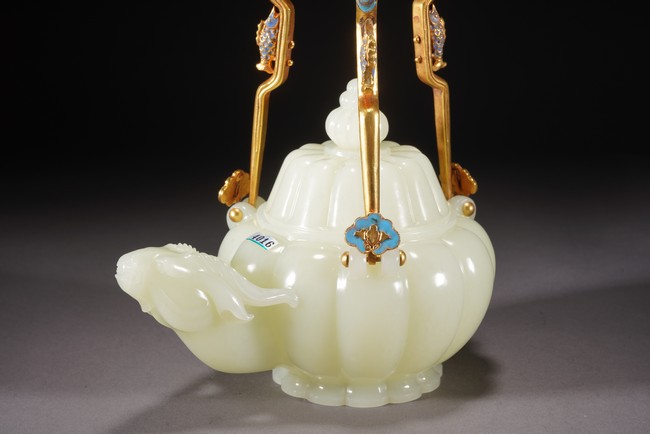 Chinese. With lobed body and raised on a splayed foot, the spout carved in the form of ram head, fitted with a lobed cover, secured with three gilt-bronze and cloisonné enamel handles, the stone is of even polished white tone. Qing Dynasty period or later.