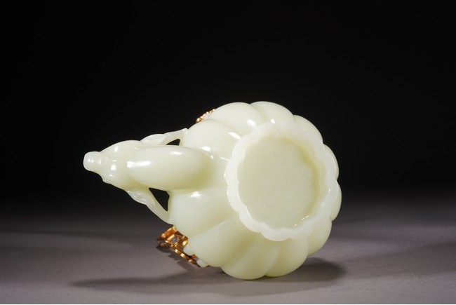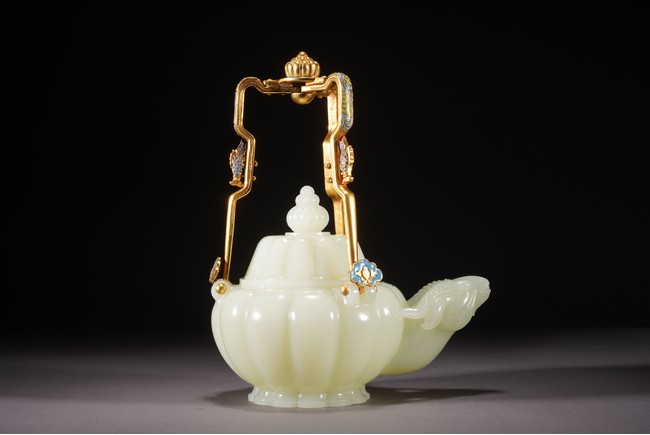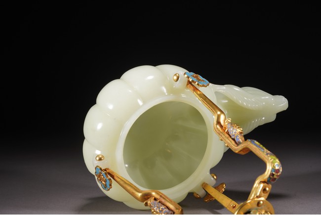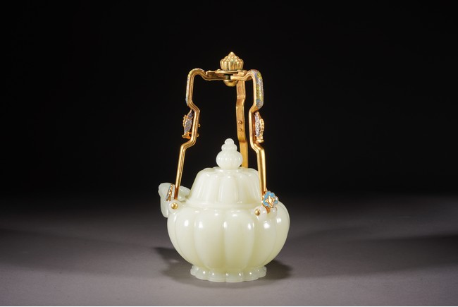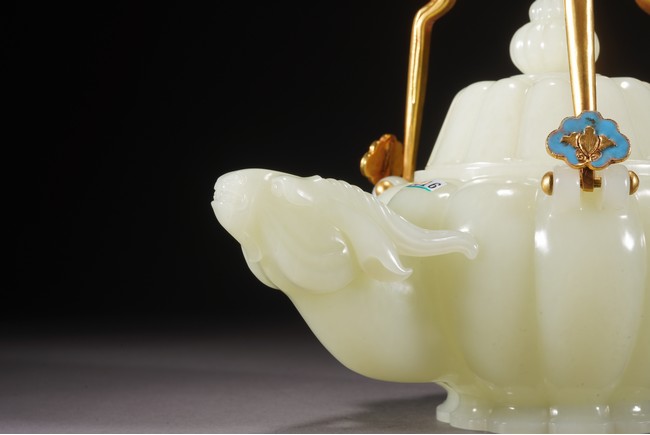 白玉羊首瓜棱式銅鑲琺瑯提梁壺,以和闐上等白玉雕琢而成,玉質細膩溫潤。器身以十二瓣瓜形為圓腹,壺蓋與足亦均分十二瓣。蓋鈕以多瓣瓜造型層層相迭為寶塔形。最精緻者為壺內及蓋內亦打凹分瓣,與外腹之十二瓣形成呼應,蓋、壺以子母口相合,嚴絲合縫。