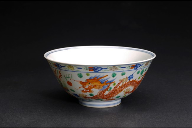 端莊規整,深腹下斂,圈足窄而垂直,外壁五彩裝飾龍紋,龍昂首呼應,怒目叱詫,鬚髮後披,兇猛矯健,大有呼之欲出之勢。整體胎骨厚薄適宜,釉質細膩泛微青,“大清乾隆年制”款識