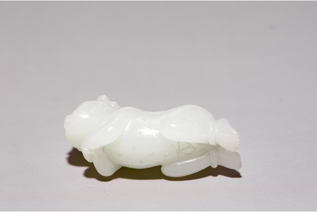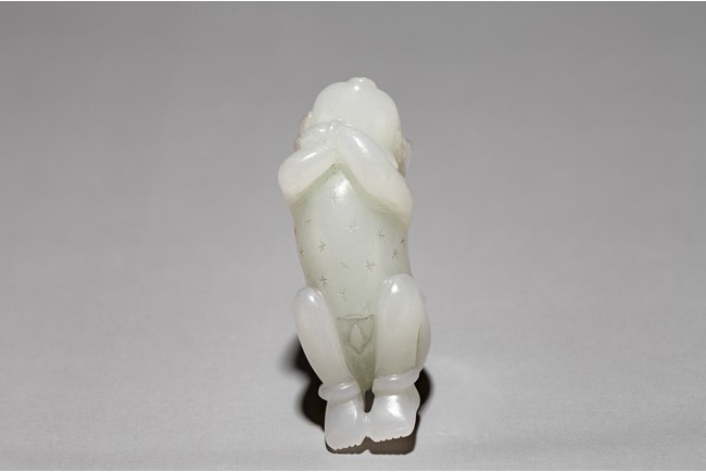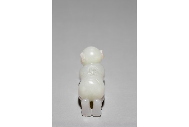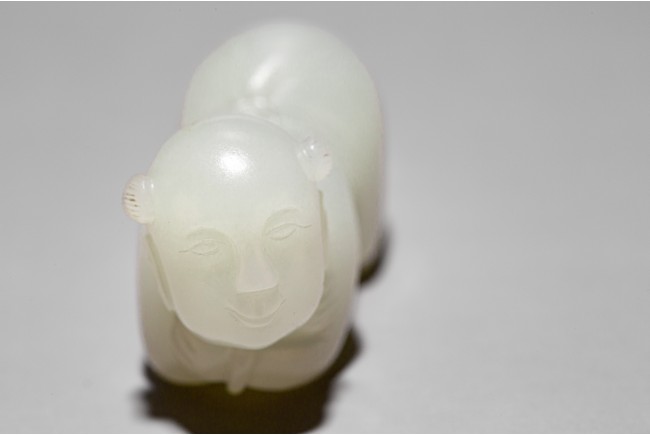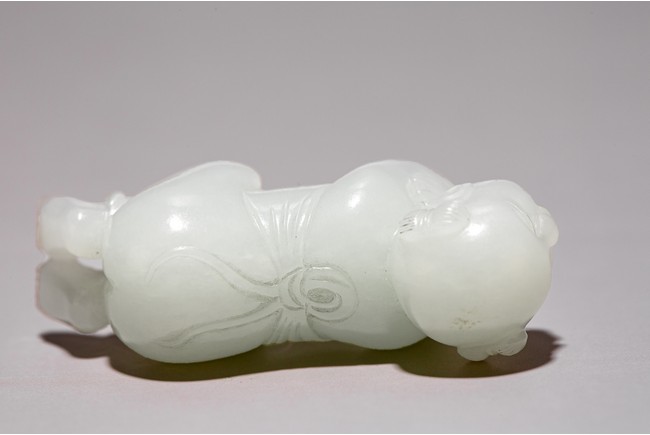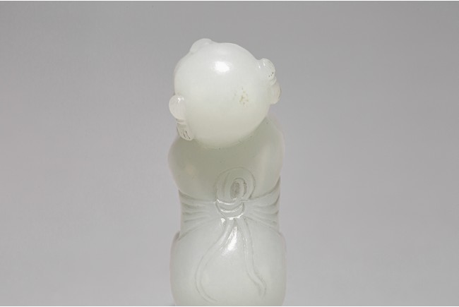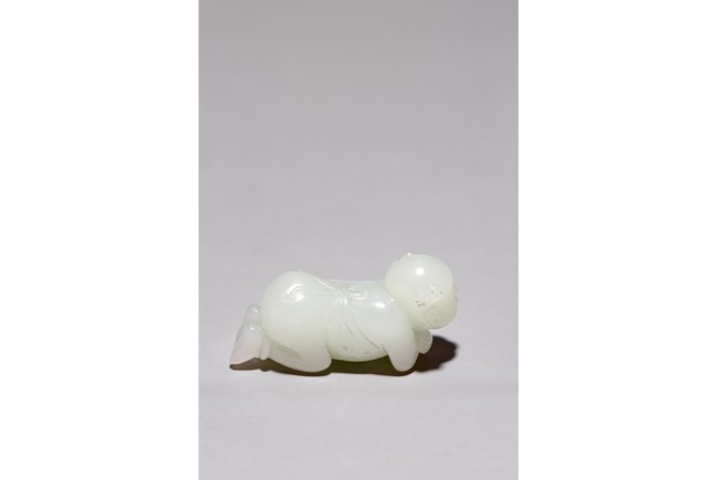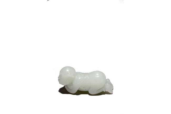 Chinese. The stone is carved in the round depicting a crouching boy with arms crossed. The semi-translucent material is of an even white tone. Qing Dynasty period.