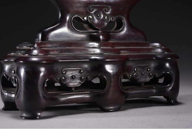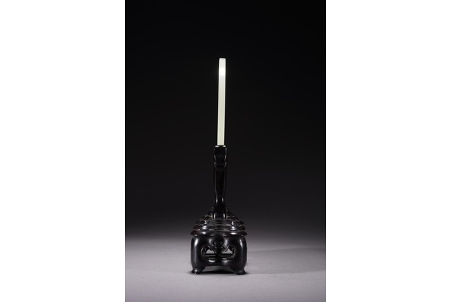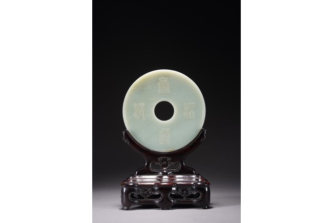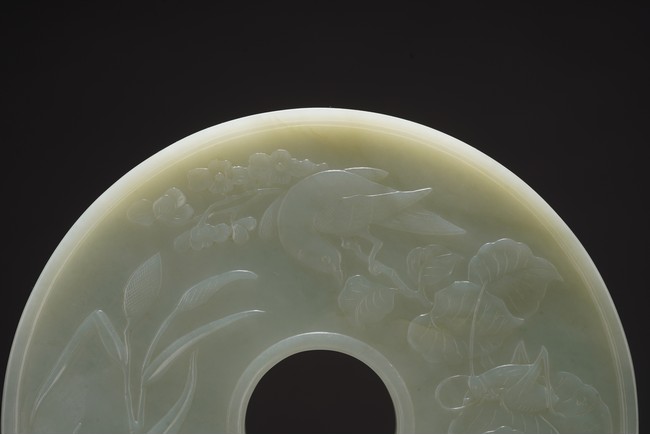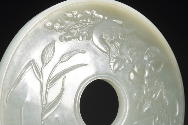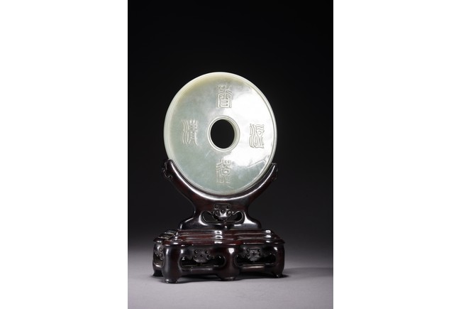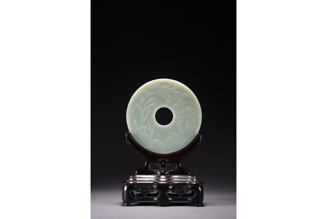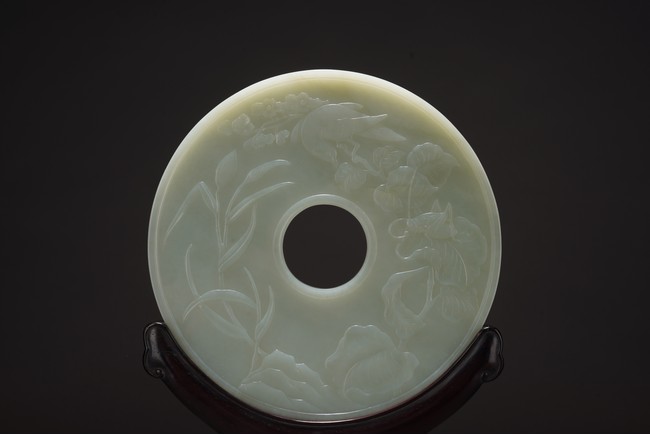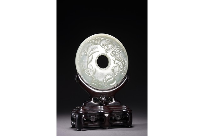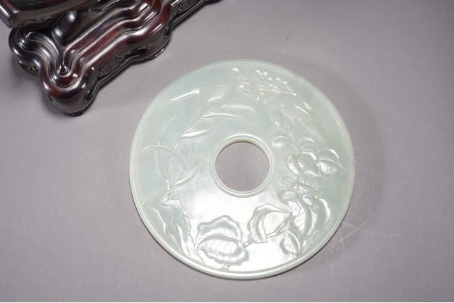 Chinese. Of disc bi form, the circular screen carved in low relief with magpie perching on leafy branch above a cricket resting on leaf, the reverse inscribed with four characters in seal script, along with hardwood stand. Qing Dynasty period.