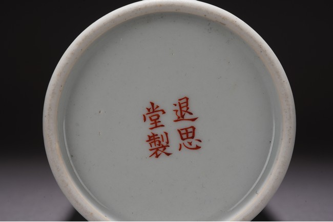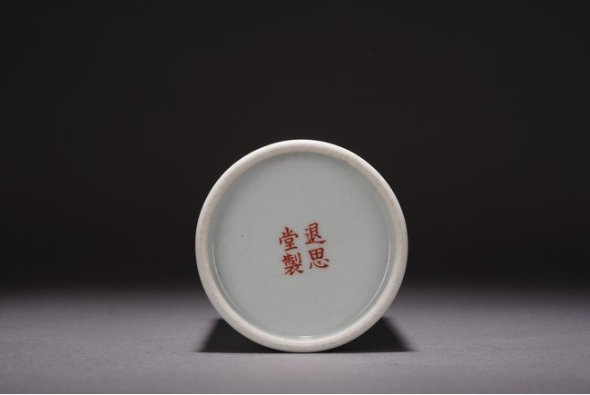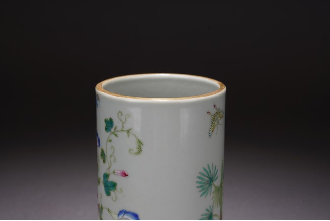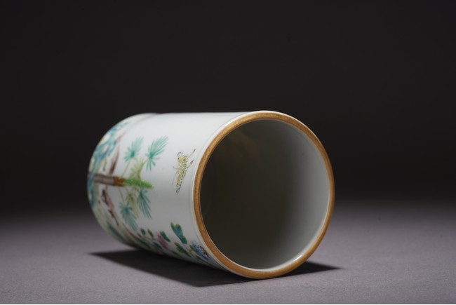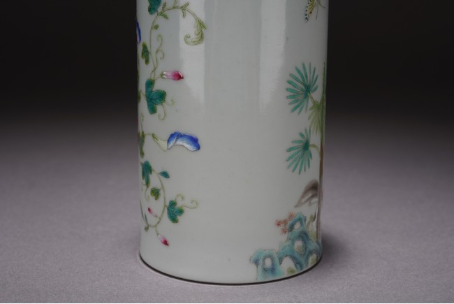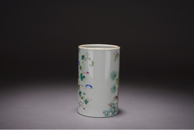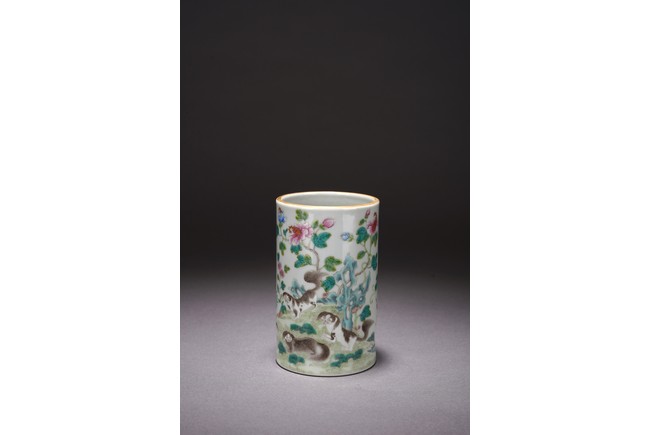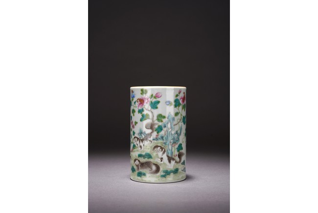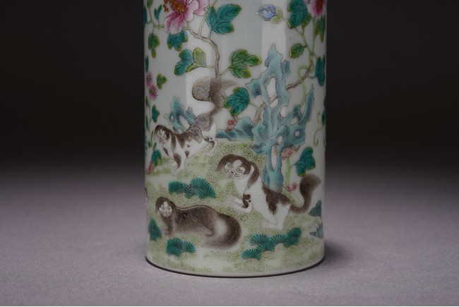 此件筆筒直口圈足,周身粉彩繪瑞犬嘻嘻圖,配以蘭石花卉紋飾,一派祥和景象,寓意吉祥。 來源:聖地亞哥香港移民家族收藏 Provenance: Property from an old Hong Kong family collection resides in San Diego
