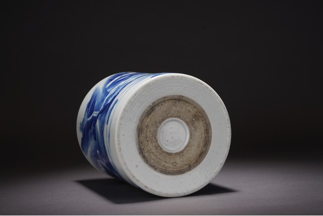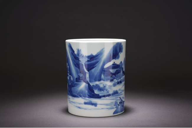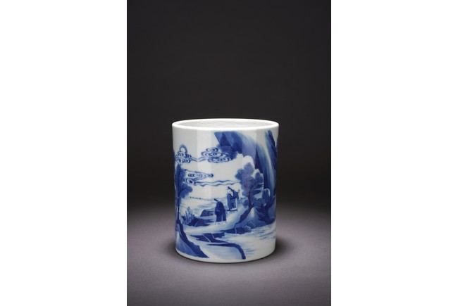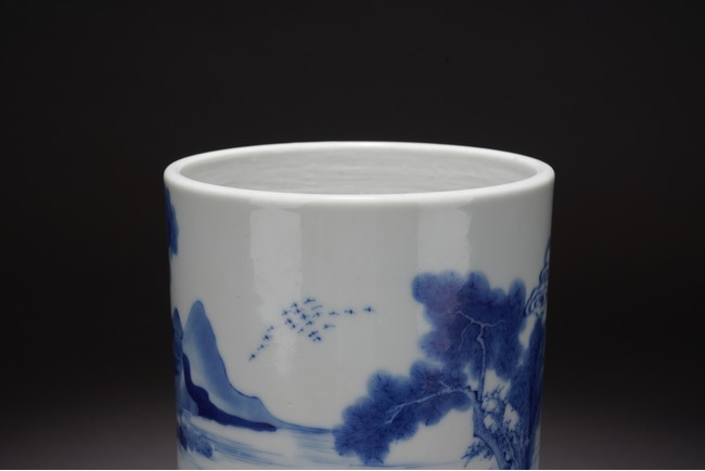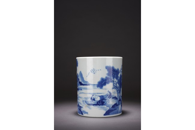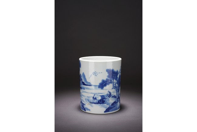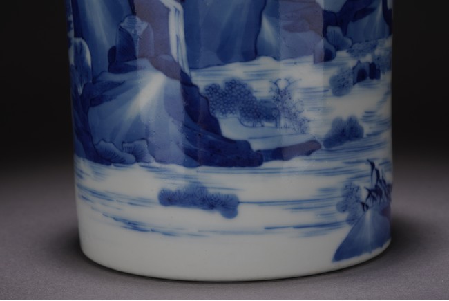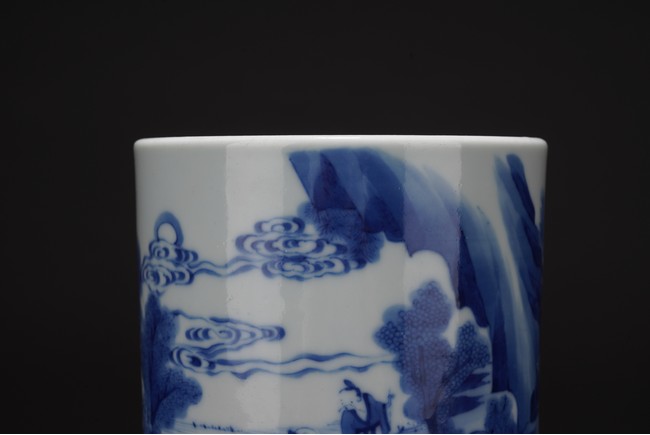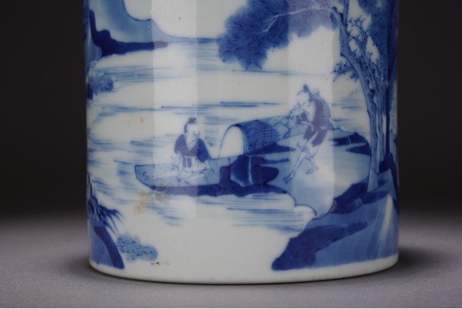Chinese. Of cylindrical form, the body decorated in blue and white with two scholars in conversation in a mountain setting, the reverse with two fisherman by the riverbank. Qing Dynasty period.