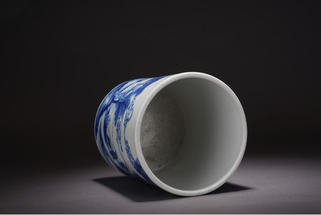 青花人物故事筆筒,造型俊美文氣,成直筒型,畫面佈滿筆筒周身,人物描繪生動傳神,神態各異,畫面生動,筆筒胎質細膩,釉色瑩潤肥厚,青花髮色沉穩,是一件不可多得的文房佳品。