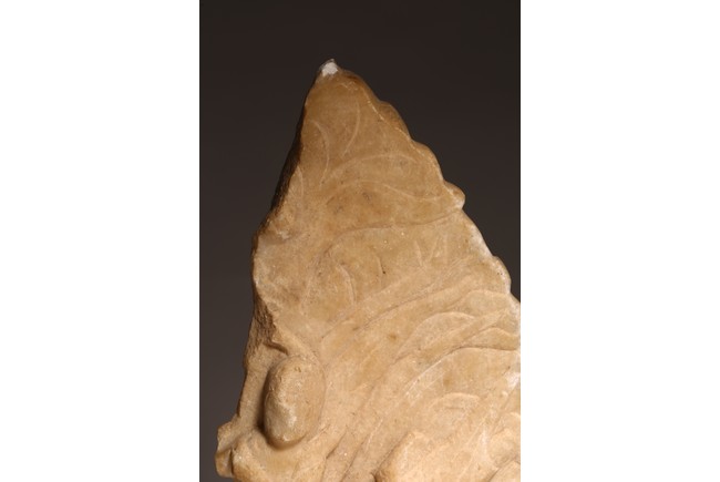 Chinese. Carved with two flying apsaras, the Chinese fairies, in high relief on a triangular fragment, all supported on rosewood stand. Northern Wei Dynasty period ( 386 to 534 AD) or later.