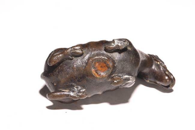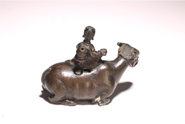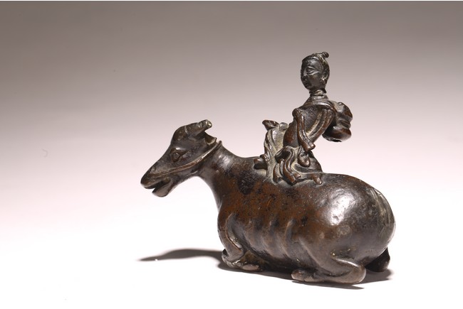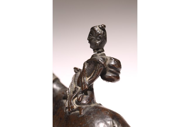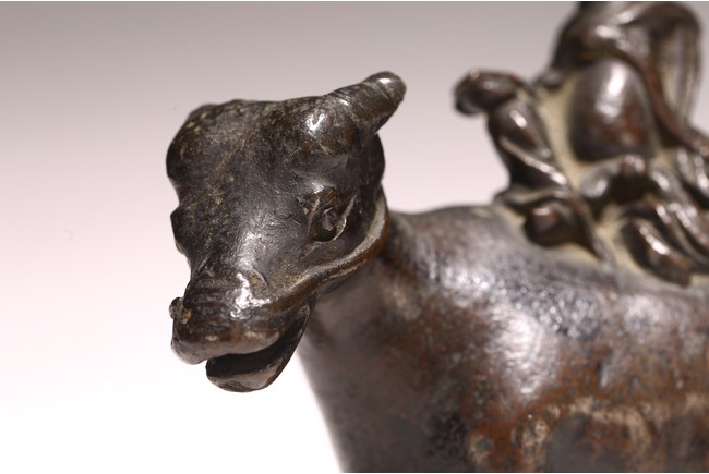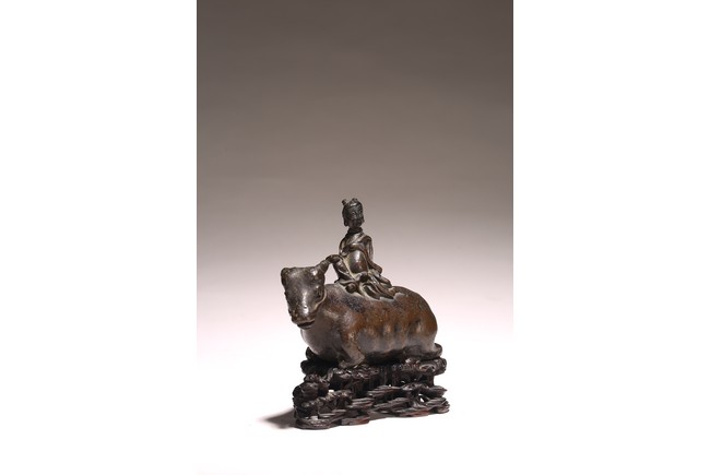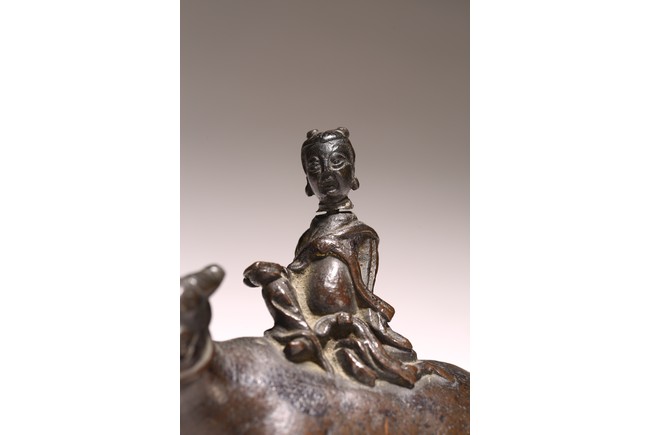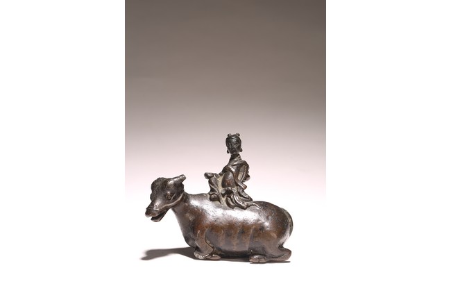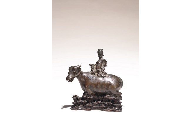 黃銅製成,銅質優良,皮色光亮,包漿肥厚,圓雕塑人物牧牛之型。牛體量壯碩,雙犄尖尖,闊鼻大口,雙目圓瞪,尾部自然下垂。人物面容方圓,彎月眉,杏眼,高鼻,小嘴,身著長袍,側坐於牛背之上。帶木座。 來源:密蘇裡州堪薩斯城私人收藏, 購於紐約蘇富比, 2018 Provenance: Property from a Kansas City, Missouri Family Estate. Sotheby's New York, 15 September 2018, Lot 1470