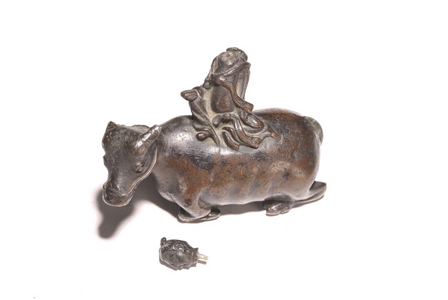 Chinese. Cast as a boy seated on a recumbent ox, the figure with a bundle strapped at the back and a parcel in one hand, raised on a fitted carved wood base. Ming Dynasty period.