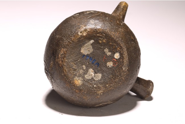 Chinese. Of bulbous form, with two spouts, the body cast with archaistic motifs in shallow relief, with circular cover. Ming Dynasty period.