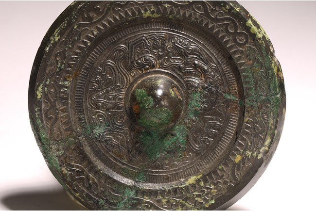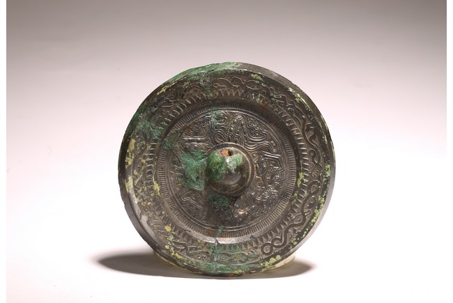Chinese. The mirror cast with stylized pattern within the rope twist borders, with patches of green, yellow, and brown encrustation. Han Dynasty period (202 BC–220 AD)