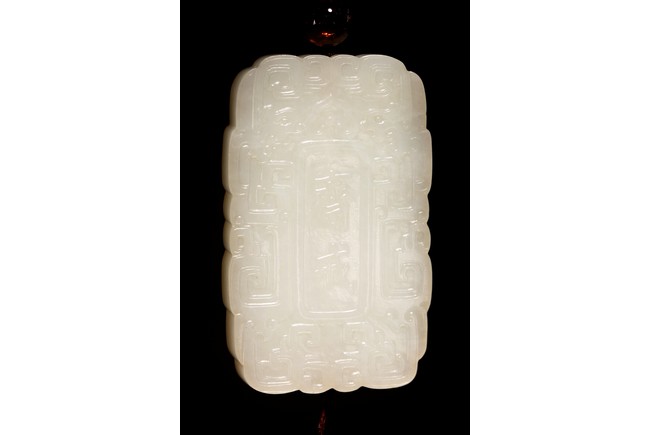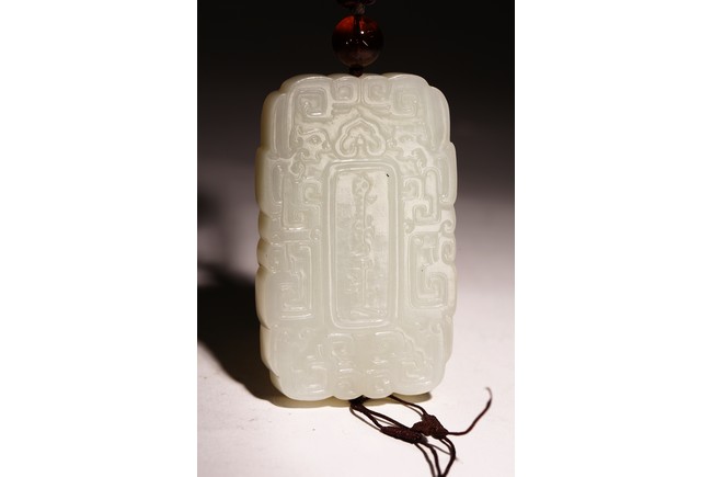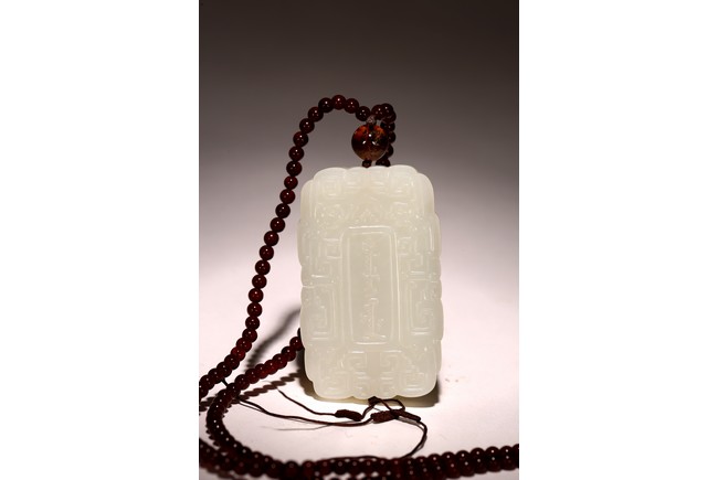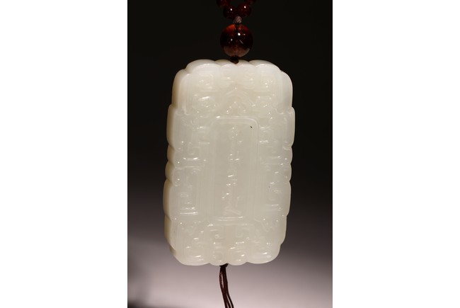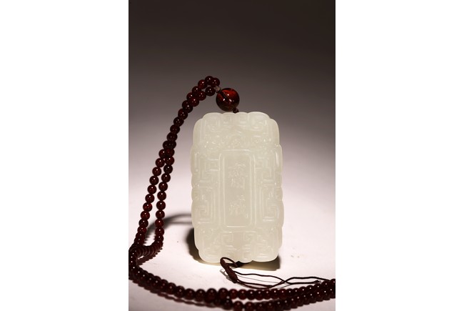 白玉製成,玉質潔白細膩,光澤瑩潤,長方形,扁平狀,正反面開光用滿文漢文刻“齋戒”二字。齋戒牌是清代皇帝及文武官員祭祀時掛於身上的警示牌。 來源:聖何塞私人收藏 Provenance: Property from a San Jose private collection