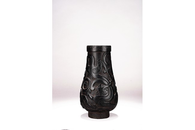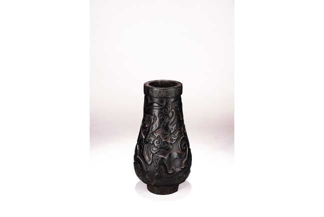 Chinese. The vase finely carved around the exterior in relief with multiple sinous 'chi-long' amidst clouds, the top and bottom rim inlaid with silver wire to form key-fret pattern. Ming Dynasty period.