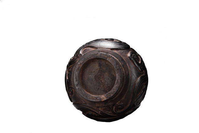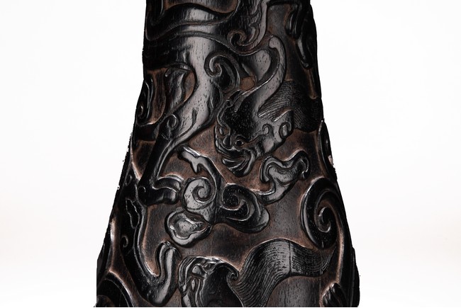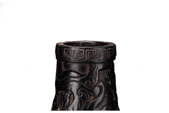 此件藏品古樸典雅,有明代古拙之美,採用紫檀材質,用料碩大,器型大氣磅礴,周身雕螭龍紋是,口與底部鑲嵌銀絲迴紋,官氣十足。 來源:洛杉磯教授藏家收藏,約1998年購於洛杉磯本地古董市場 Provenance: Property from a professor's private collection, acquired from estate sale in Los Angeles circa 1998.