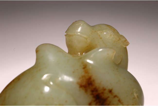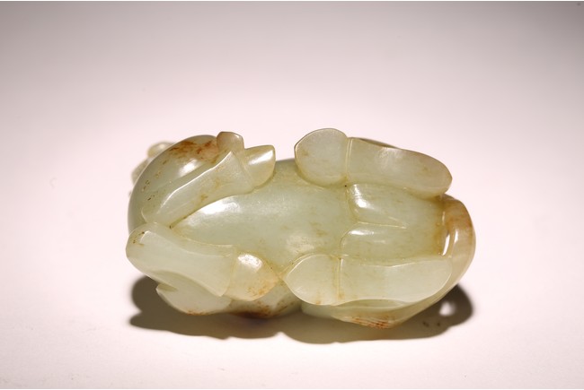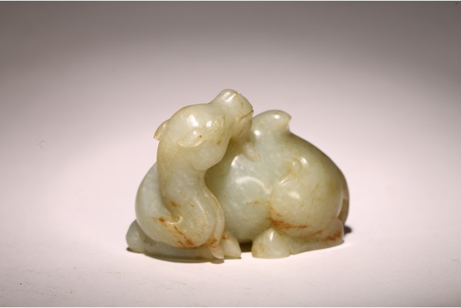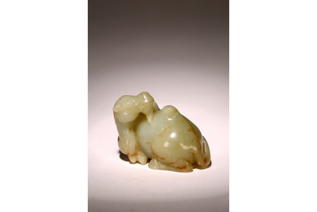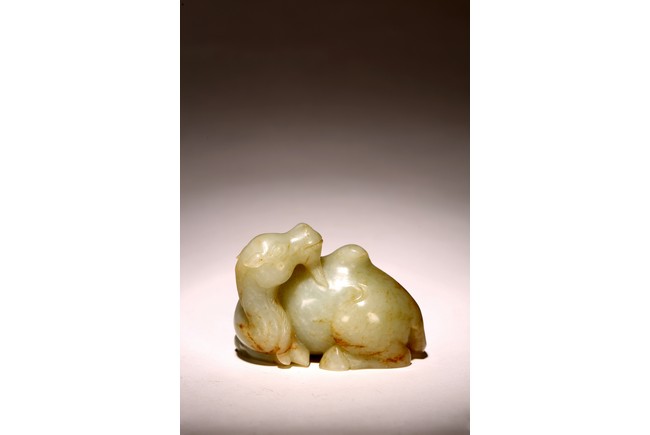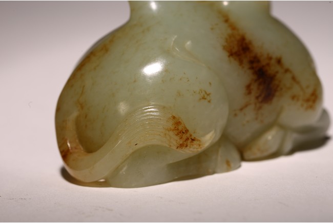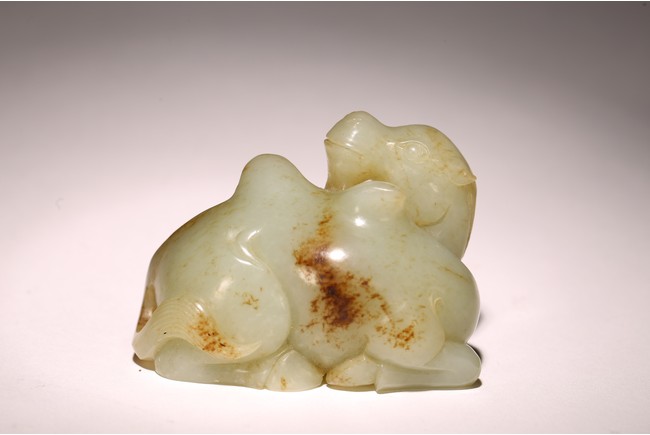 青白玉製成,玉質溫潤,色澤純正,局部帶有沁色。圓雕駱駝,呈回首狀,前後腿向內屈膝,跪臥狀,長眼、大鼻、寬嘴,雙耳後豎,頷下有長須,粗頸,大腿肌肉飽滿,琢磨細滑。 來源:聖何塞私人收藏 Provenance: Property from a San Jose private collection