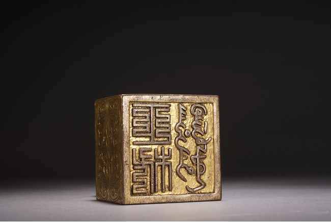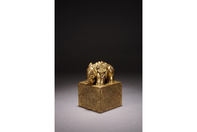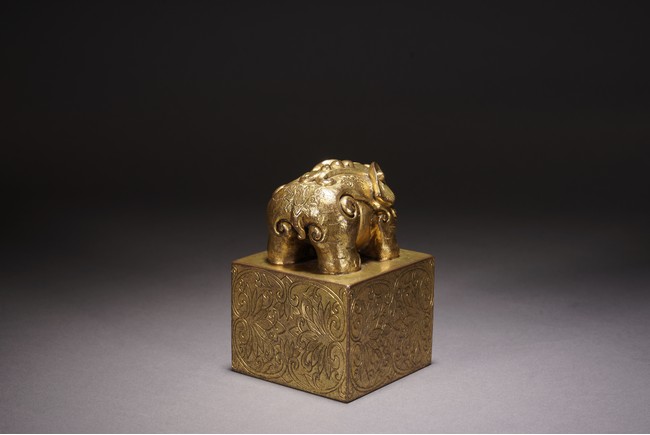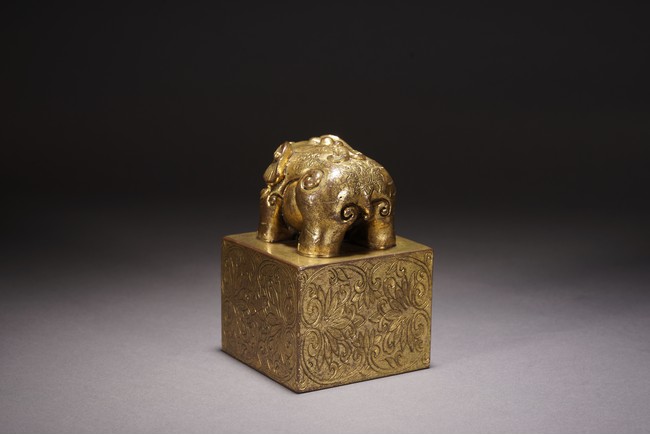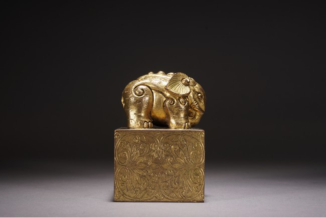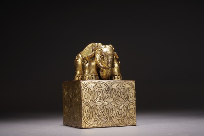銅製印章,象鈕,呈蹲踞狀,雙耳後揚,栩栩如生,寓“萬象更新”意,印台呈方形,通體攢刻花卉紋飾,精銅所製,器型厚重,手感沉甸,其構思之巧、雕琢之妙,可謂匠心獨運。