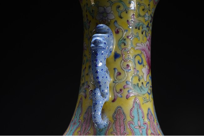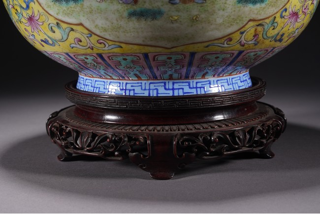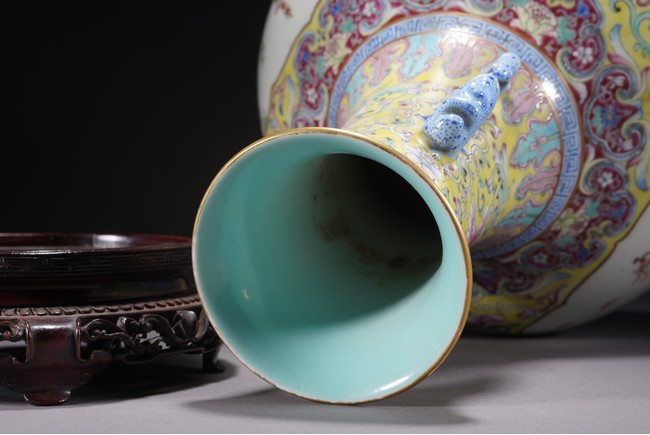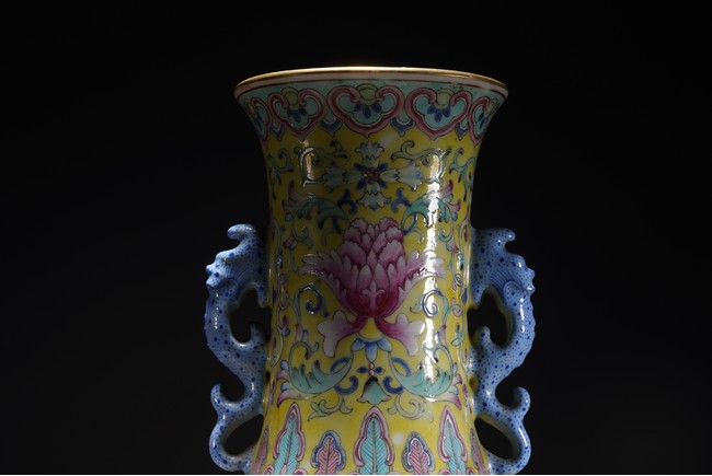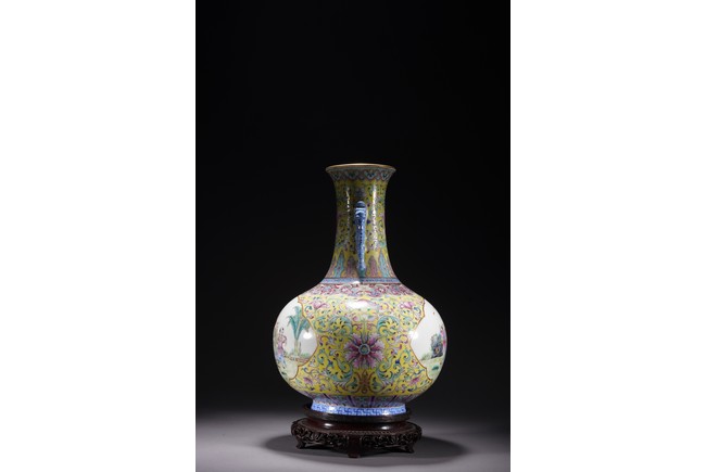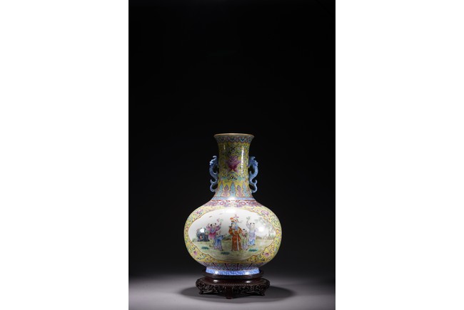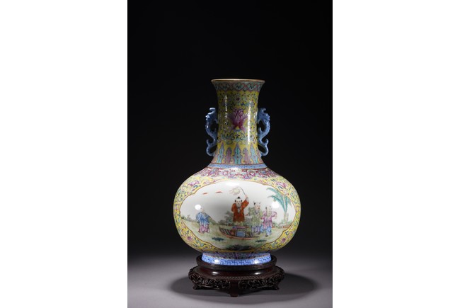 此賞瓶精美雍容華貴,雙螭龍耳,腹部渾圓,器型精緻豐滿線條秀美,此器繪畫更是複雜,粉彩繪畫花卉纏枝,開光人物故事風景,顯得雍榮華貴,色澤亮麗純淨,使所要描繪的對象顯得質感強,明暗清晰,層次分明,淋漓揮灑,落落大方,底足青六字篆書(大清乾隆年制)官款,為難得的精品,收藏潛力頗大,珍貴非常
