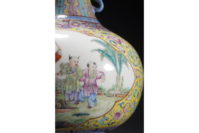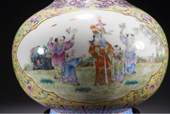 Chinese. The compressed globular body surmounted by a flared neck, adorned with medallions decorated with boys playing in garden, the neck decorated with upright stiff leaves and lotus sprays , the foot underlined by a frieze of petals, base inscribed with six character reign mark. Qing Dynasty period.