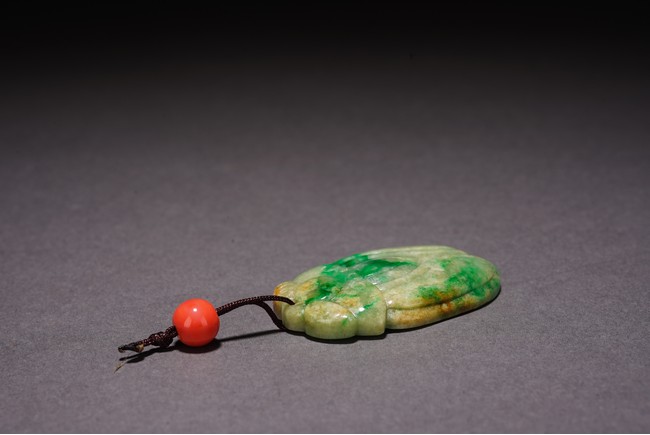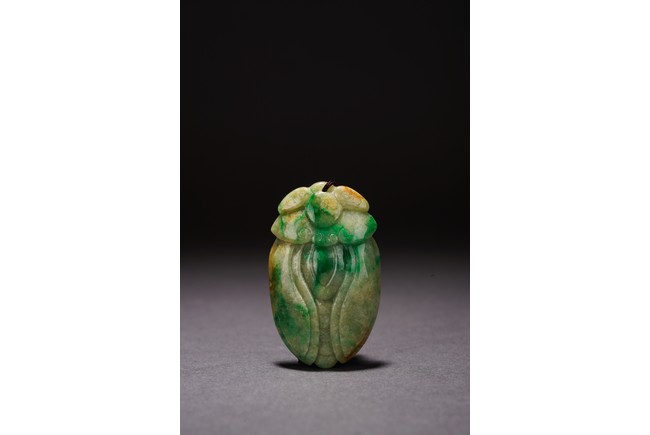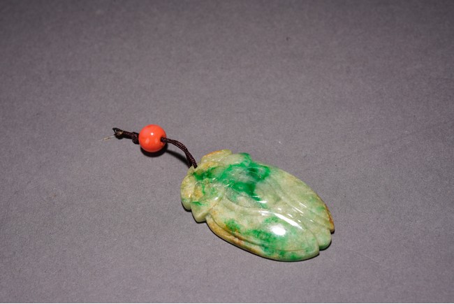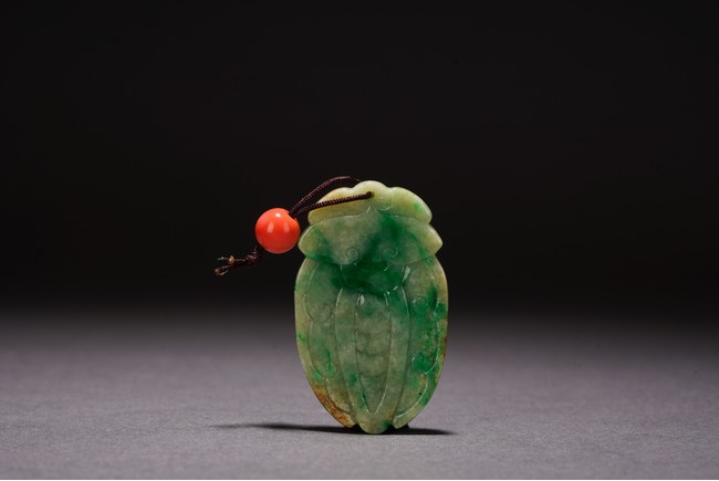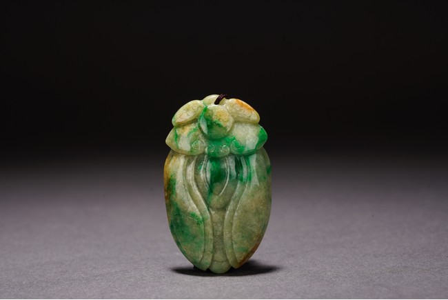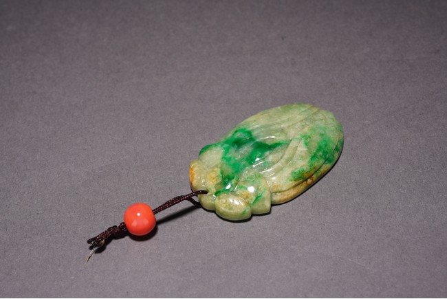 Chinese. Carved in the form of a cicada, the stone is of semi-translucent mottled bright green and celadon tone. Qing Dynasty period.