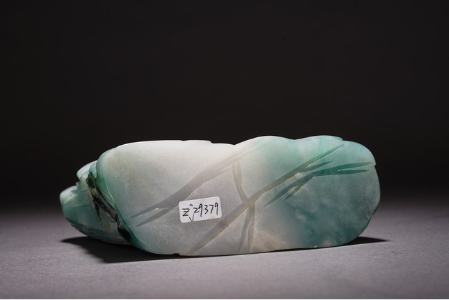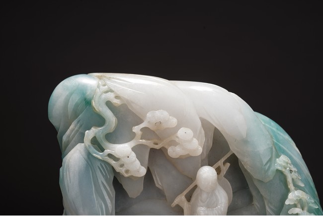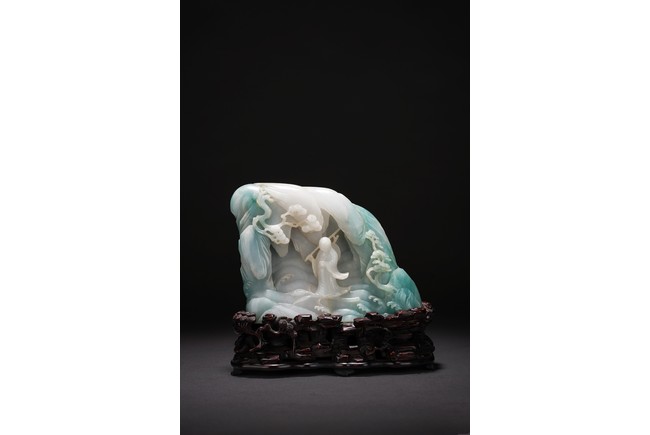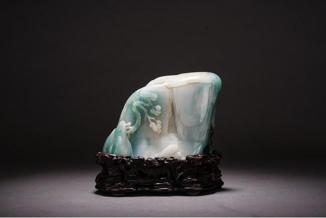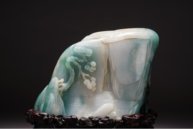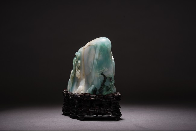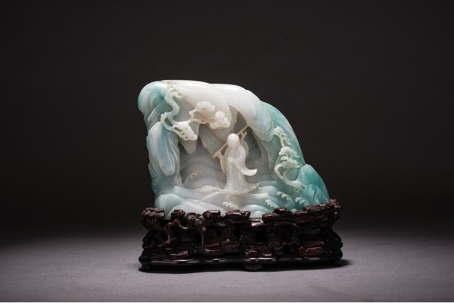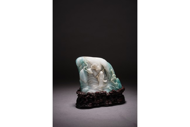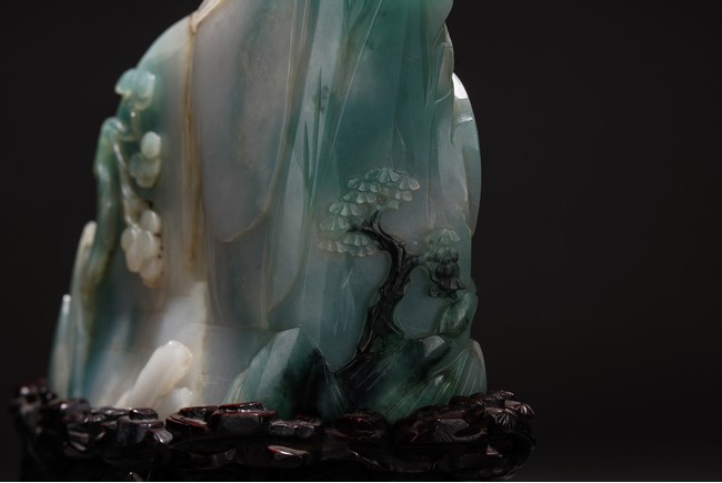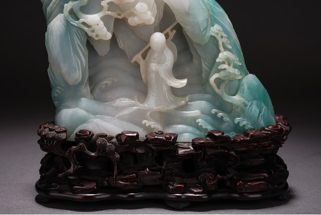 Chinese. The boulder finely carved with Bodhidharma crossing the Yangtze river on a reed, the reverse carved with pine tree issuing from rocks, the stone is of translucent apple green and white tone, along with hardwood stand. Late Qing Dynasty/Republic period.