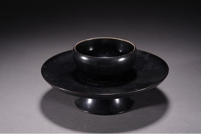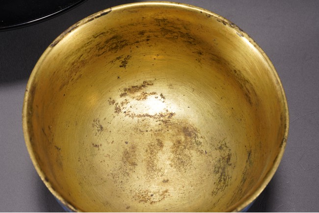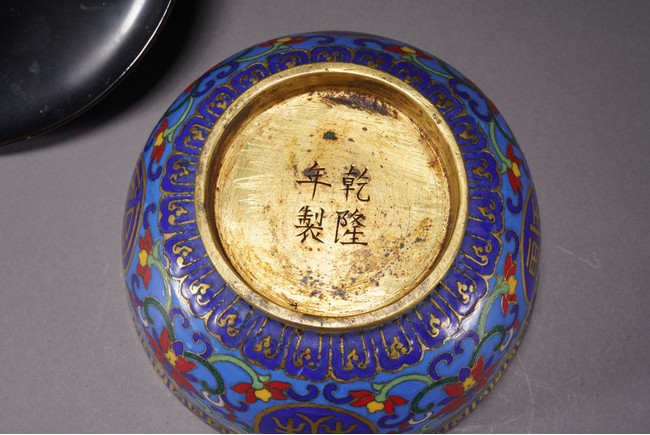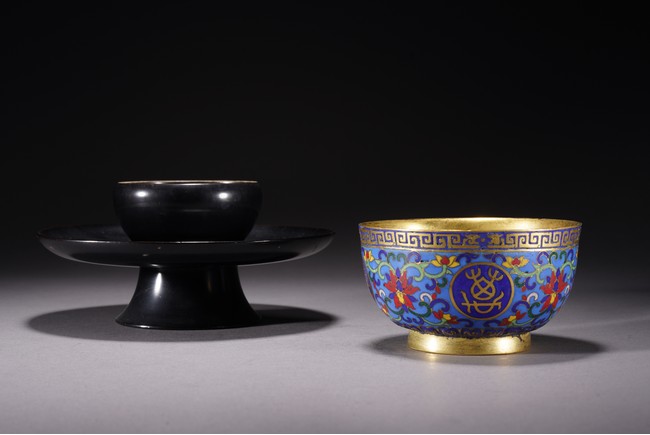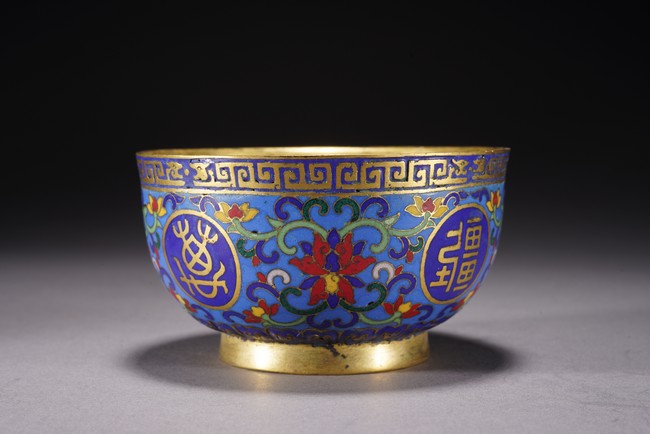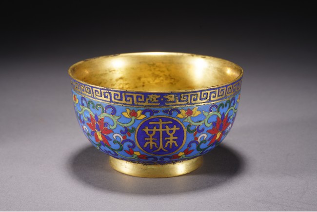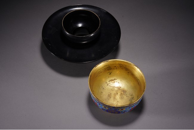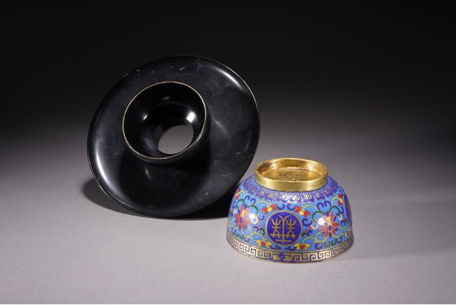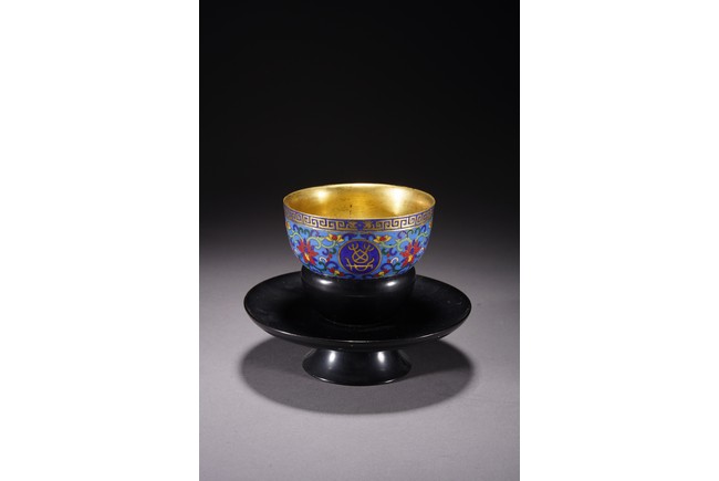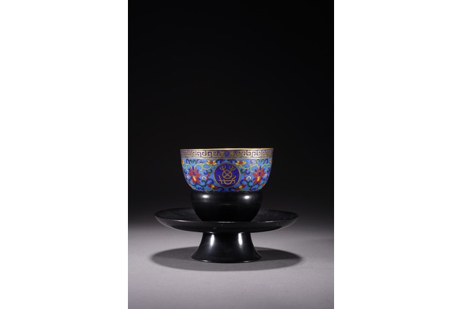 Chinese. The interior richly gilded, the exterior enamel with the four stylized characters forming the phrase 'longevity without border' in between the lotus scrolls, the base inscribed with four character reign mark, with lacquer stand. Qing Dynasty period.