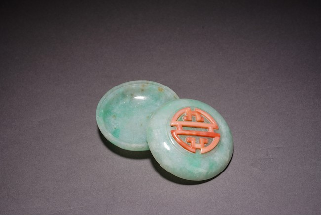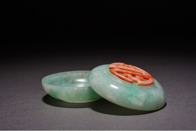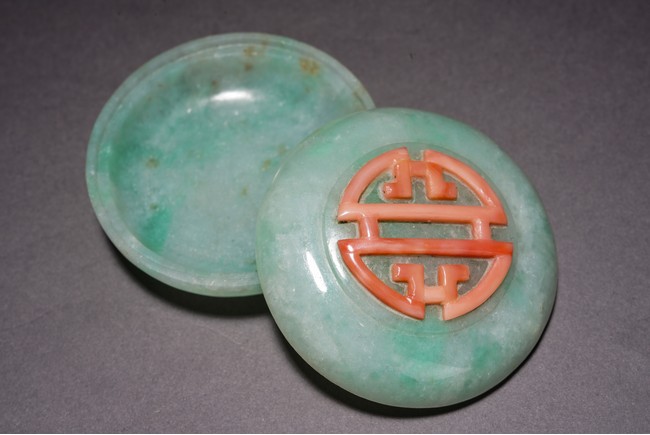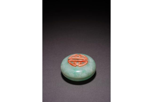 Chinese. Of circular form, the box cover inlaid in coral with stylized shou character. The stone is of translucent apple green tone. Qing Dynasty period.